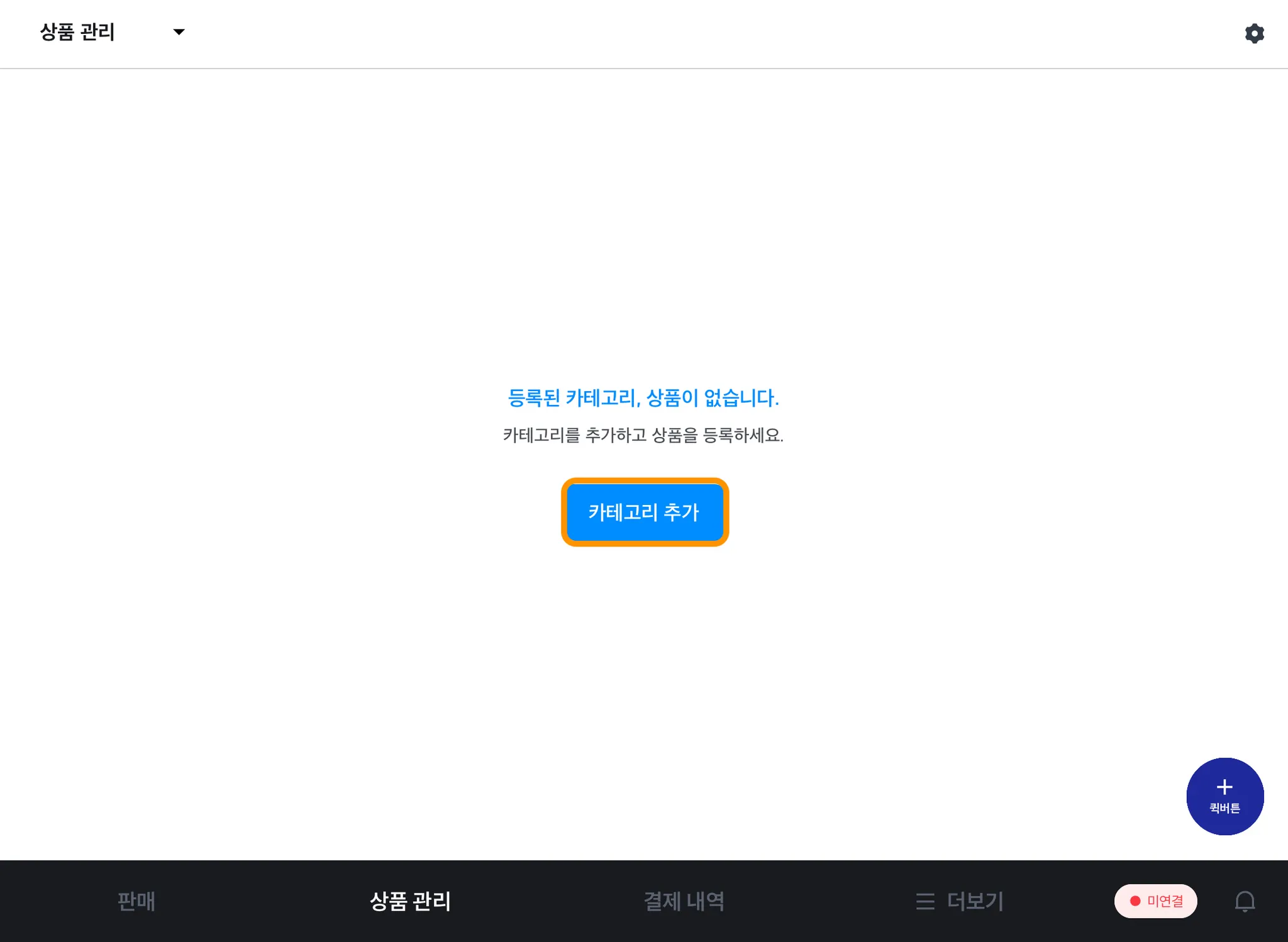1) [상품 관리] 탭 → [카테고리 추가]를 눌러 카테고리를 생성해 주세요.