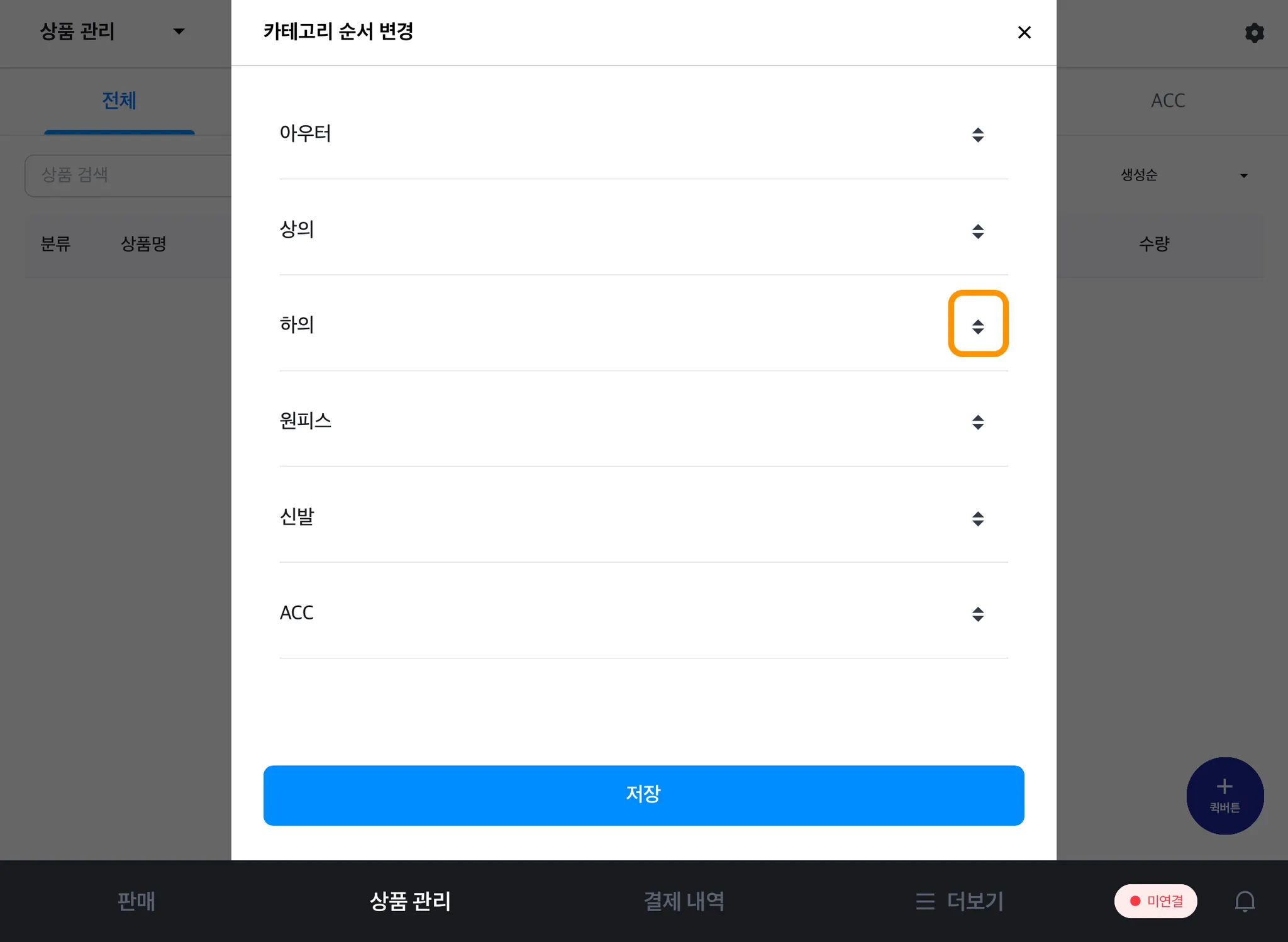 3) 이동하고 싶은 카테고리의 [화살표 버튼]을 꾹 눌러 이동시키고 [저장]을 눌러주세요.