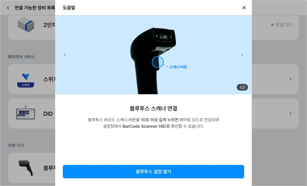 바코드 스캐너와 연결 기기는 1:1로 연동할 수 있어요.