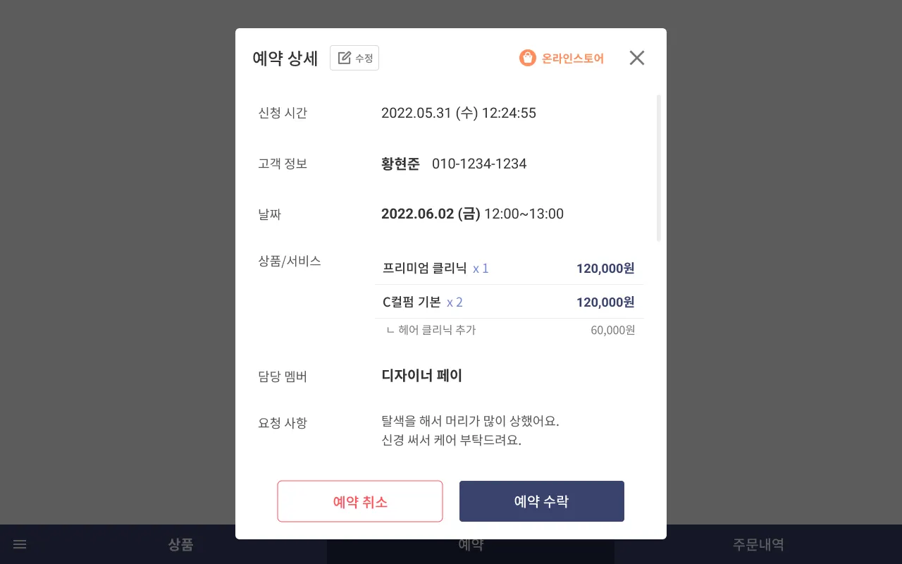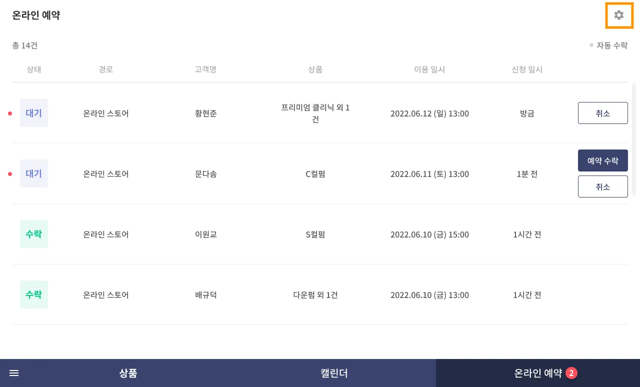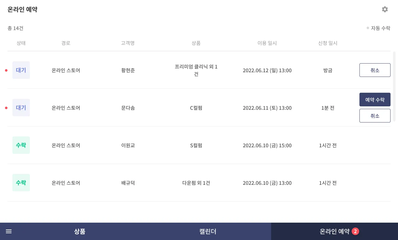 2) [온라인 예약] 탭에서 개별 예약을 수락/취소할 수 있습니다.