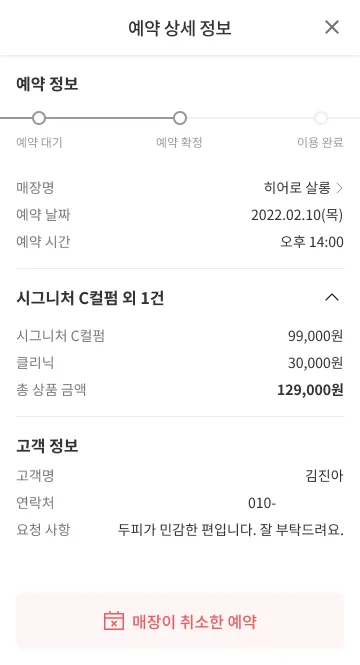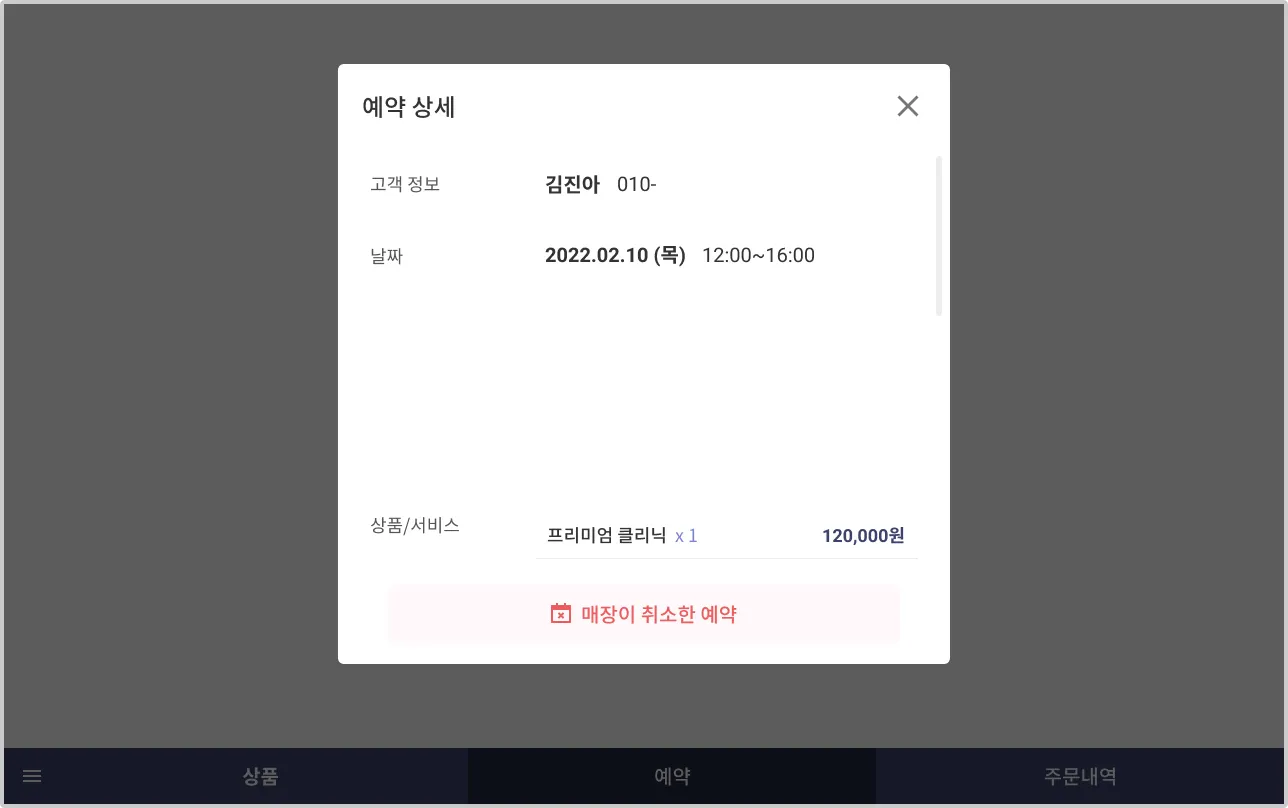 5) 매장이 취소한 예약은 예약 상세 내역 하단에 [매장이 취소한 예약]으로 표시됩니다.