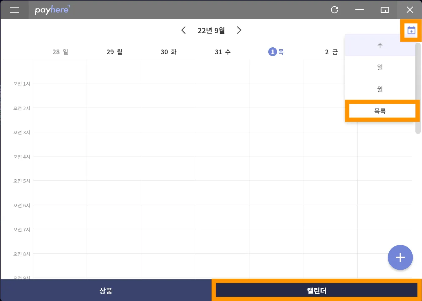 PC 포스의 경우, [캘린더] 탭 → 우측 상단 아이콘 → [목록]을 눌러 예약을 확인할 수 있습니다.