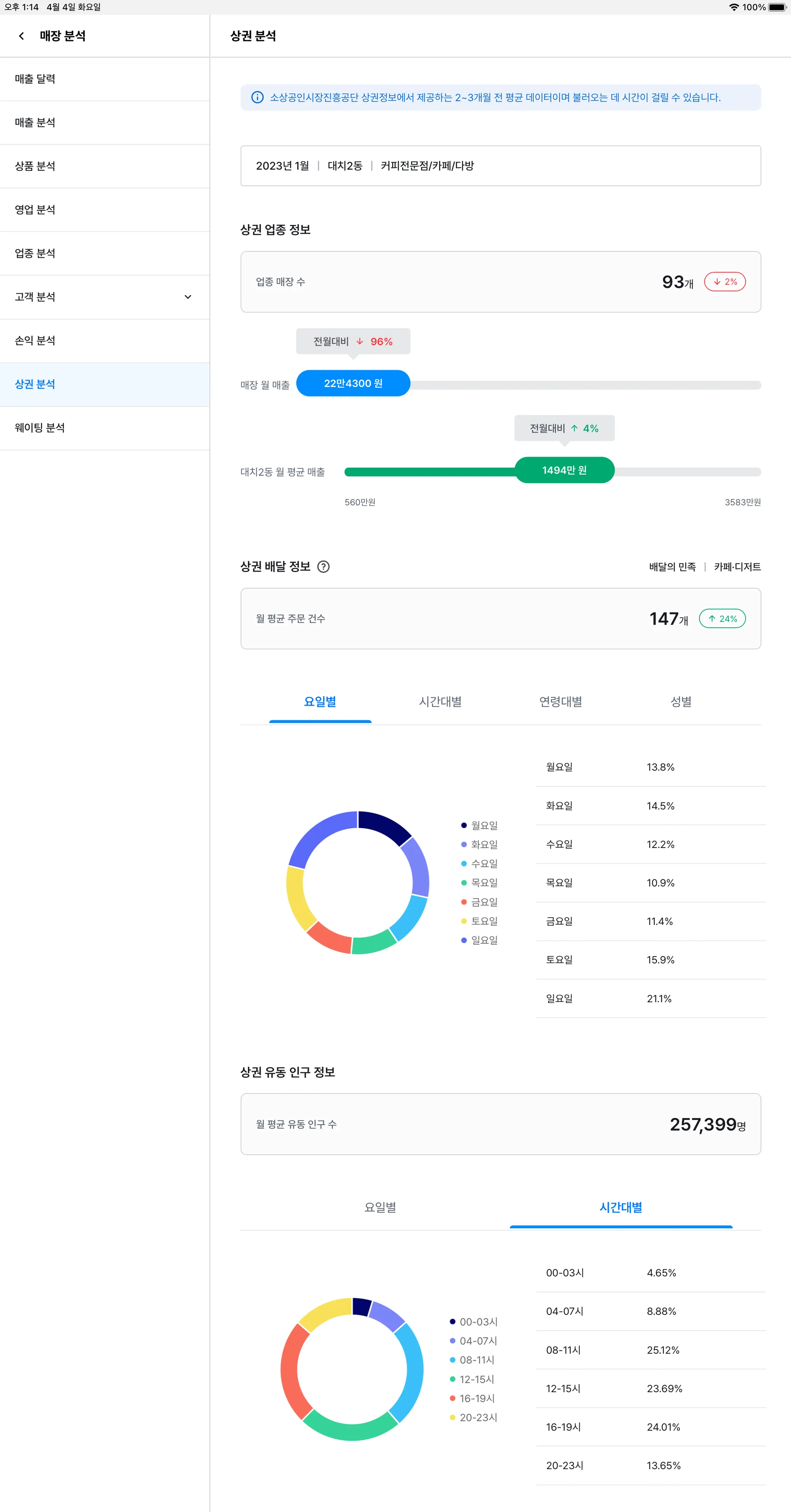 상권이나 업종에 따라 배달 분석, 유동 인구 정보 등이 지원되지 않을 수 있습니다.