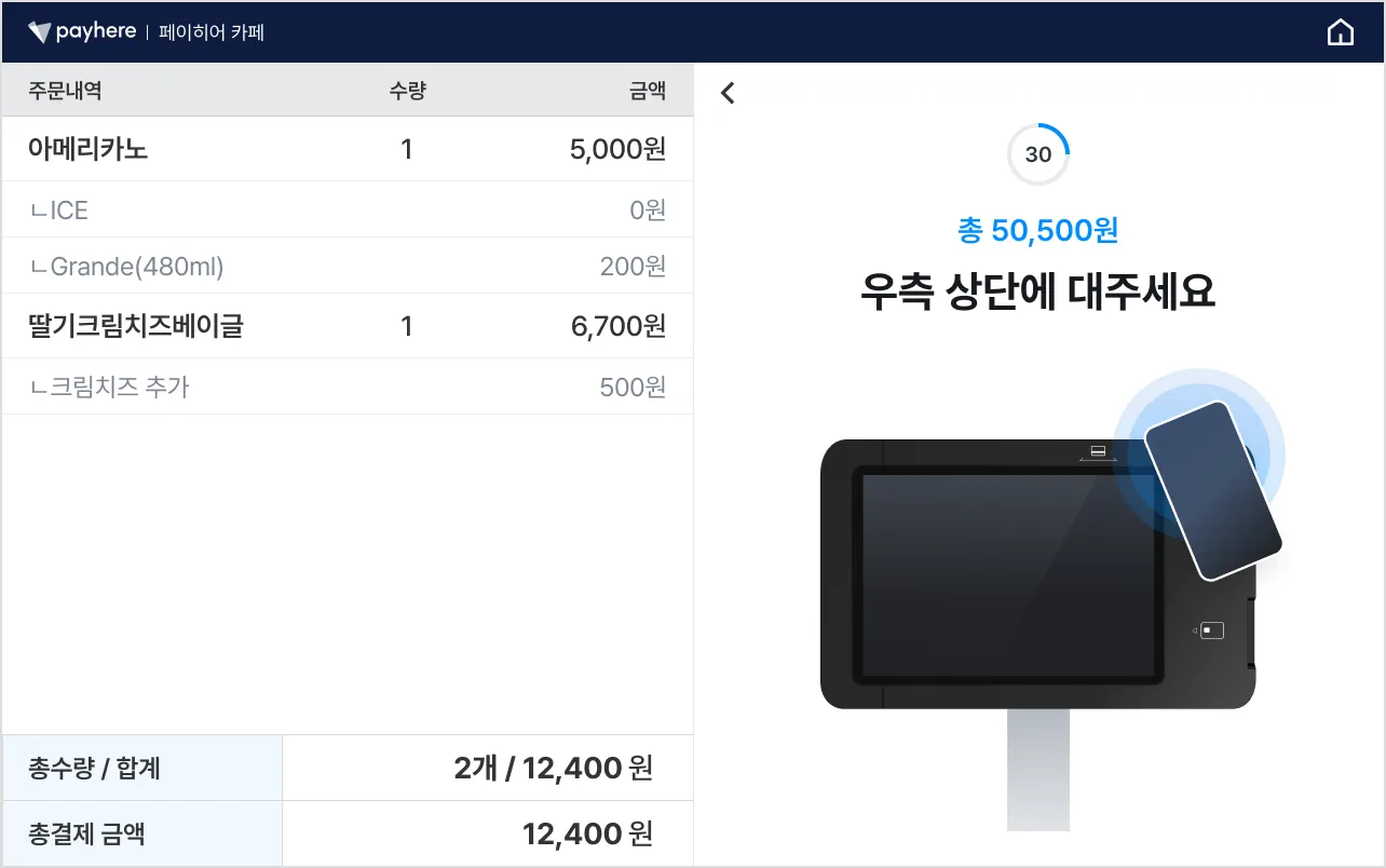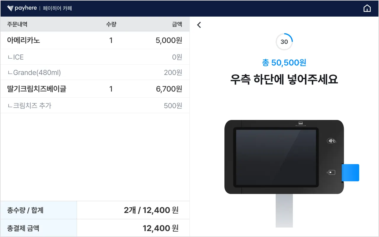 50,000원 이상 결제 시, 결제 수단 인식 후 할부 선택 및 서명 입력 화면이 나타나요.