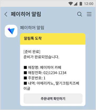 페이히어 셀러 [주문 내역]에서 주문을 [완료]로 변경하면, 고객에게 알림톡을 전송하여 호출할 수 있어요.