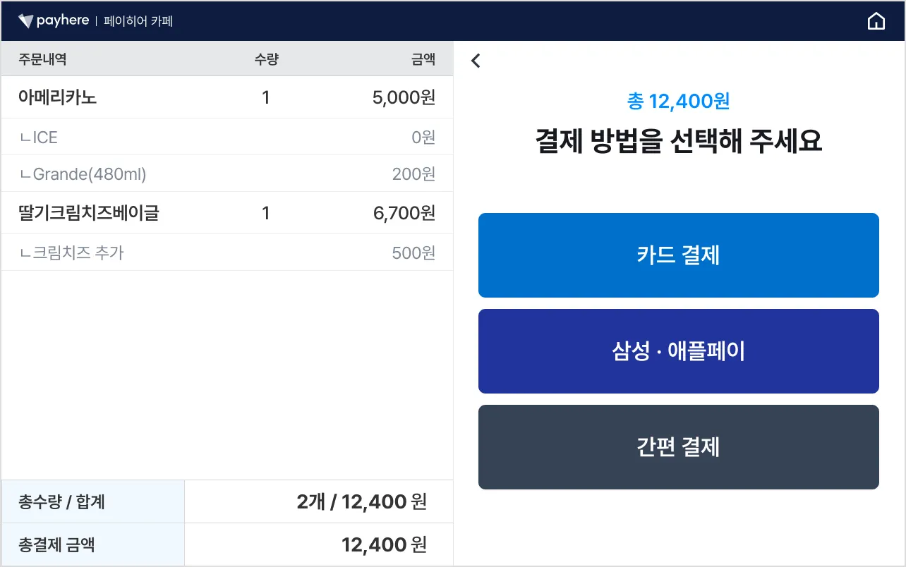 결제 수단별 예시 화면은 오른쪽에 나타나요.