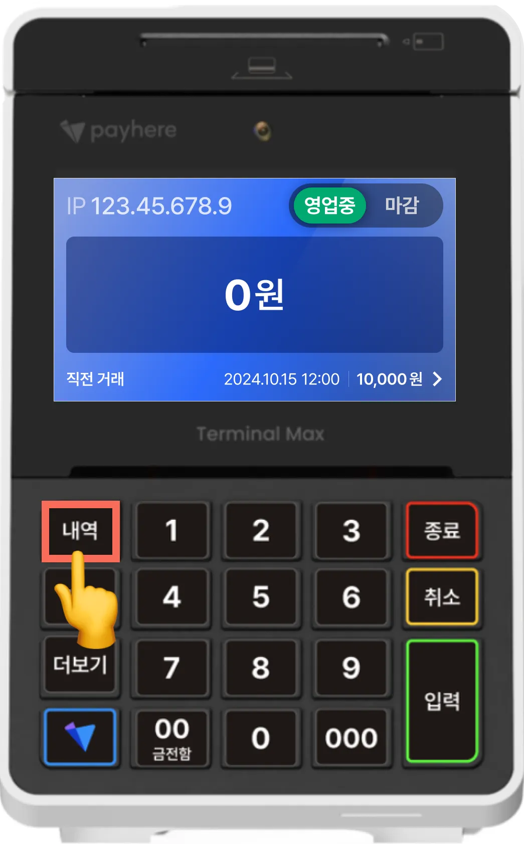 1) 터미널 맥스 키패드에서 [내역] 키를 눌러주세요.
