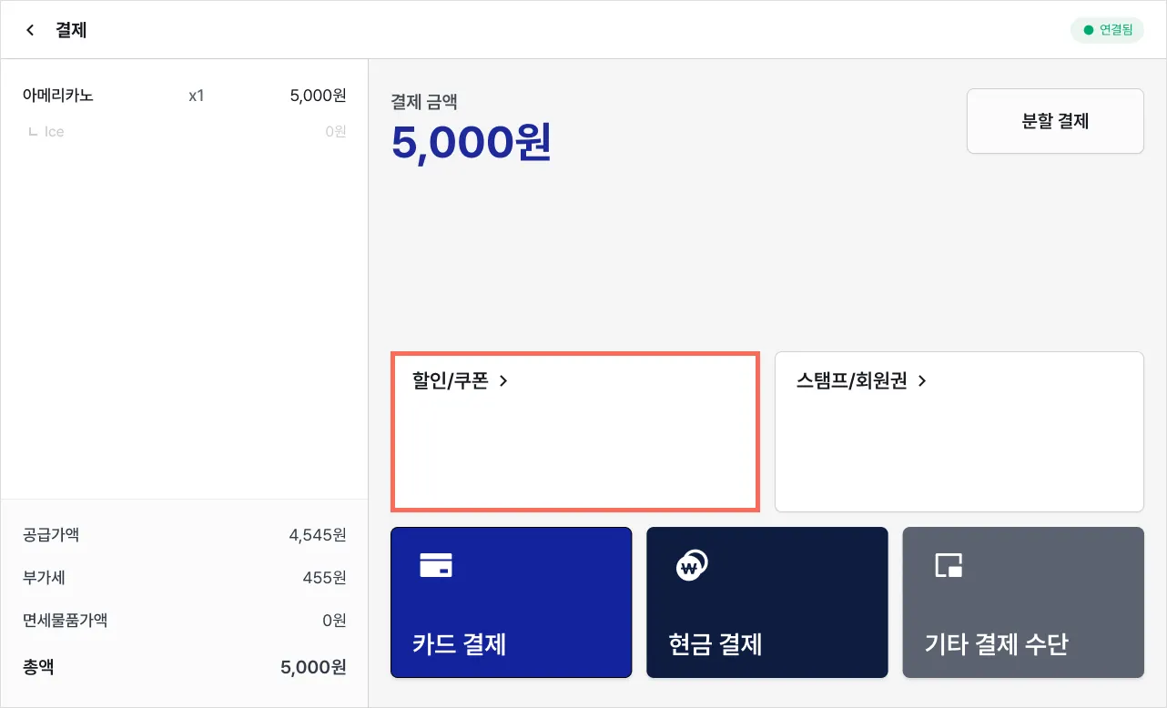 1) 결제 화면에서 [할인/쿠폰]을 눌러주세요.