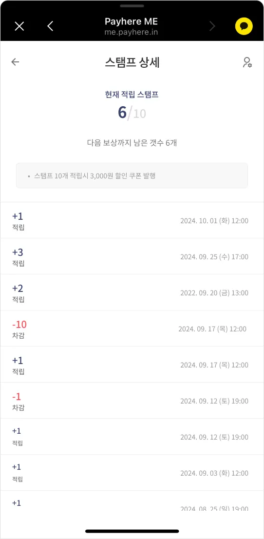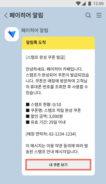 2) 알림톡 내 [스탬프 내역] 또는 [내 쿠폰 보기]를 누르면 페이히어 ME로 이동해요.
