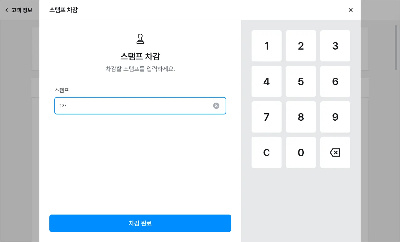 4) 스탬프 개수를 입력한 후 [적립 완료] · [차감 완료]를 눌러주세요.