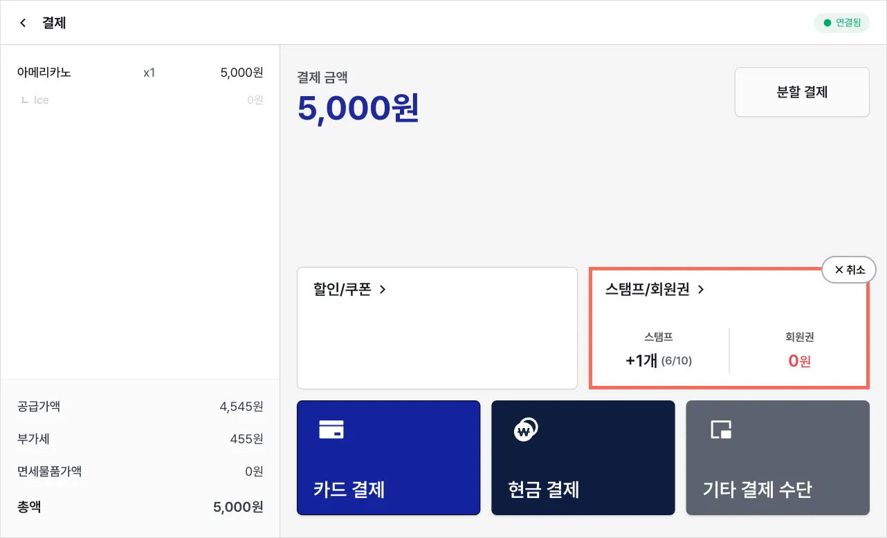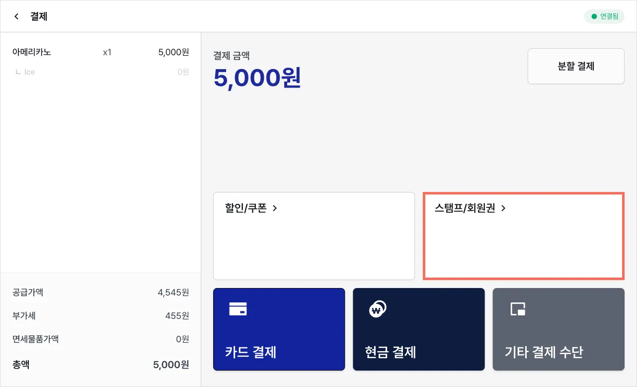 1) 결제 화면에서 [스탬프/회원권]을 눌러주세요.