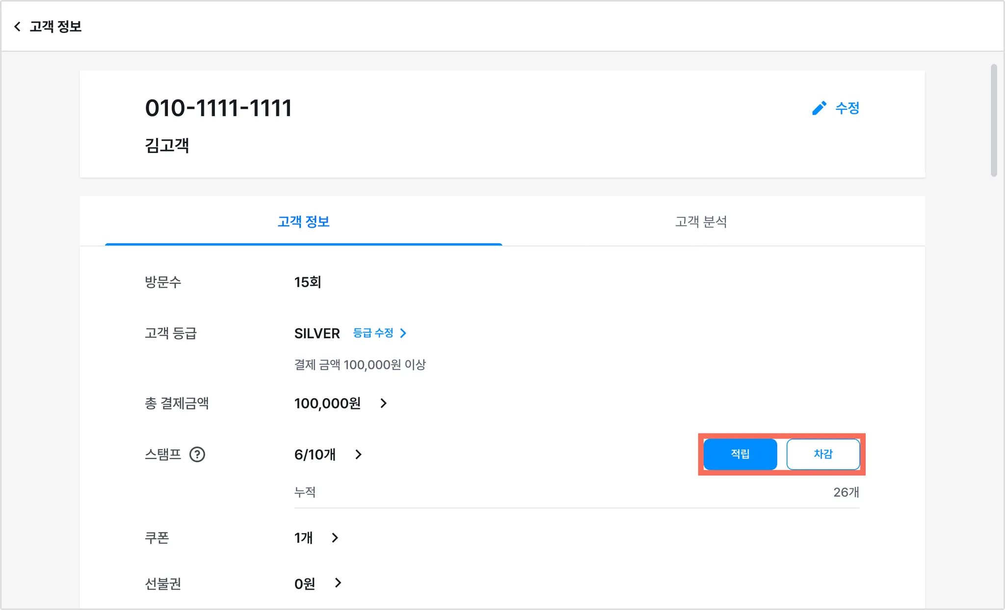 3) [고객 정보]에서 [적립] 또는 [차감]을 눌러주세요.