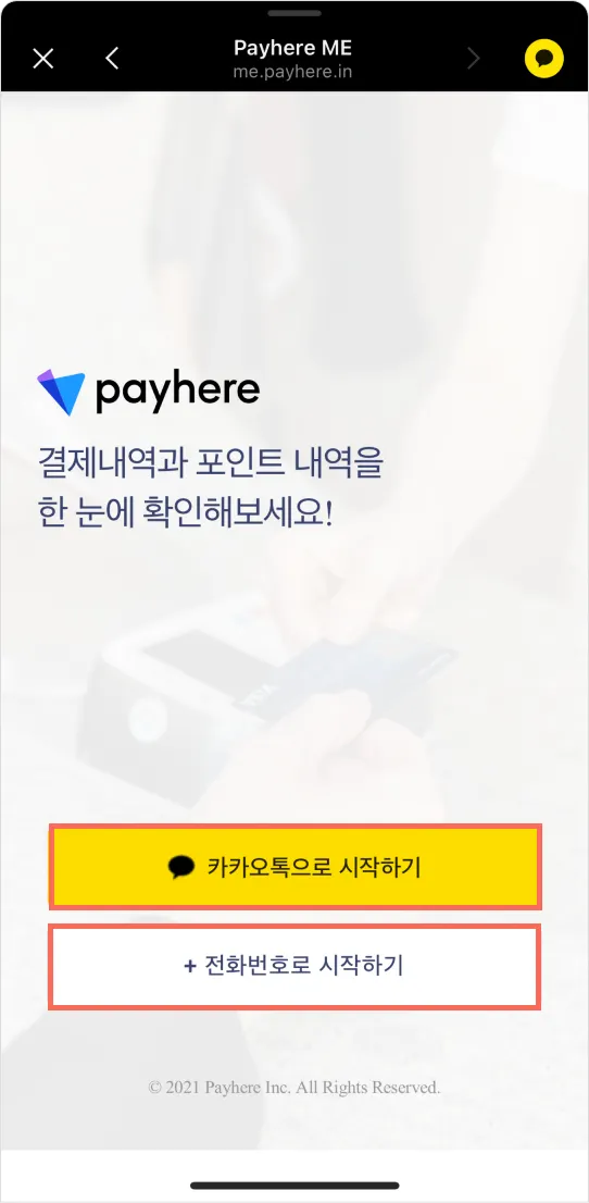 [카카오톡으로 시작하기] 또는 [+전화번호로 시작하기]를 눌러 인증을 해 주세요.