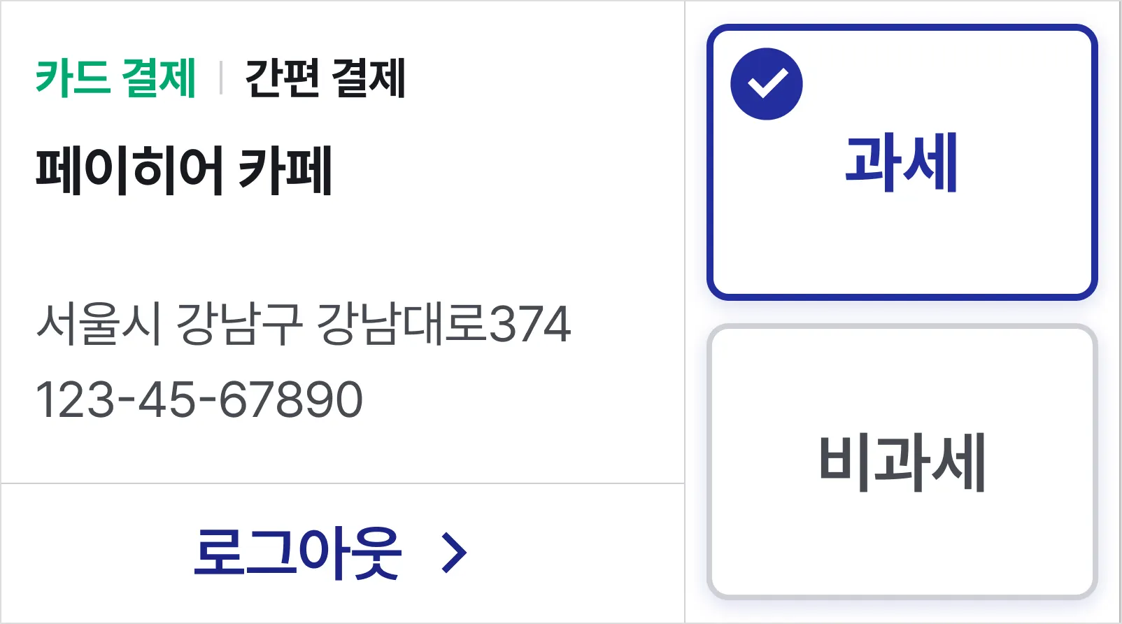 [나의 매장 정보]를 누르면 매장 정보는 물론, 판매자 [과세] · [비과세] 설정 및 [로그아웃]을 할 수 있어요.
