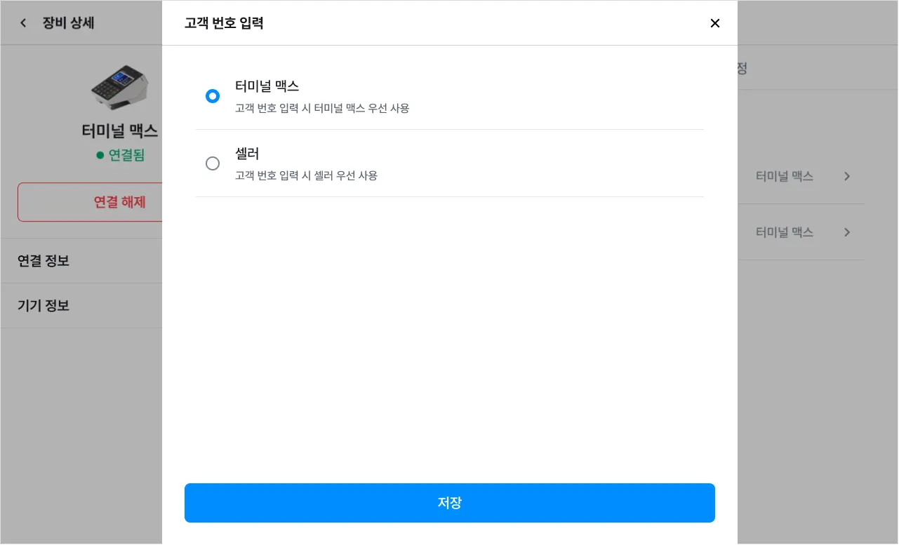 4) 서명 또는 고객 번호 입력 시, 터미널 맥스와 셀러 중 어느 화면에서 우선 입력할 것인지 설정할 수 있어요.