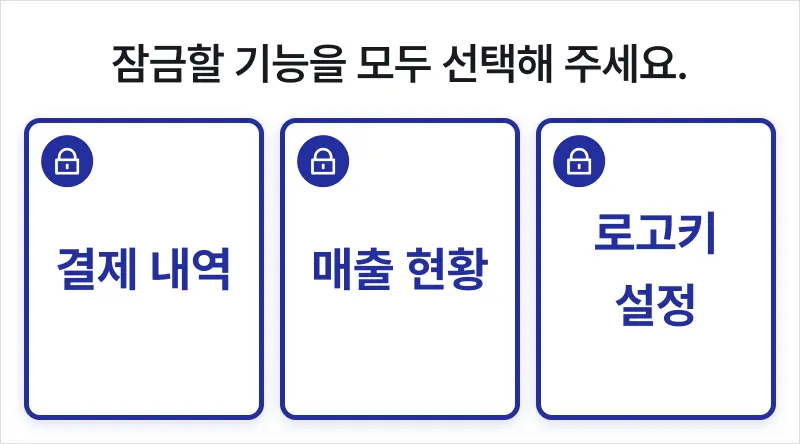 결제 내역 · 매출 현황 등 민감 정보에 쉽게 접근할 수 없도록 비밀번호를 설정할 수 있어요.