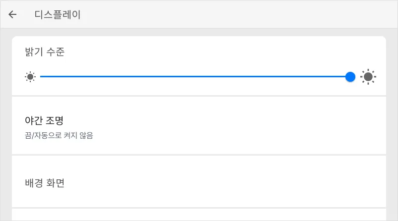 화면 밝기 · 화면 자동 잠금 시간 · 눈 보호 모드 등 디스플레이 설정을 할 수 있어요.