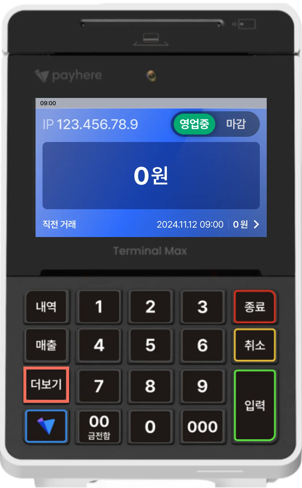 터미널 맥스 키패드에서 [더보기] 키를 누르면 관련 설정들을 확인할 수 있어요.