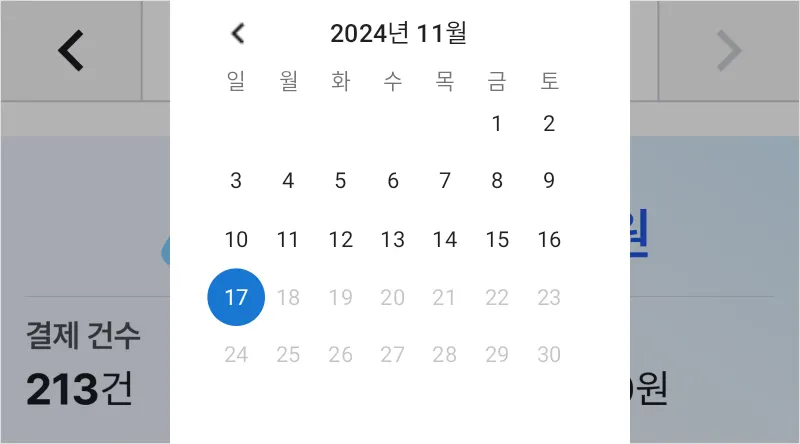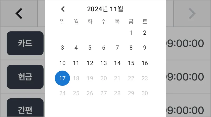 2) [<] · [▼] · [>]을 눌러 이전 영업일 또는 원하는 날짜의 결제 내역을 확인할 수 있어요.