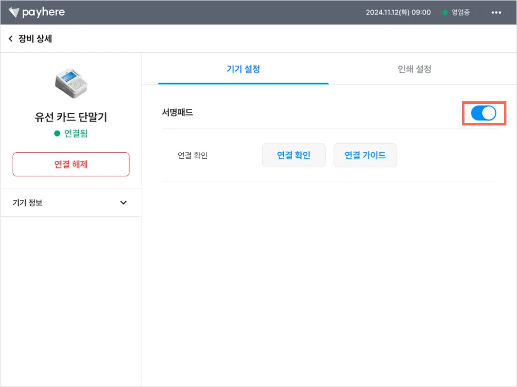 6) 멀티패드를 연결한 분들은 [유선 카드 단말기]를 누른 후, 장비 상세에서 서명패드가 사용으로 설정됐는지 확인합니다.