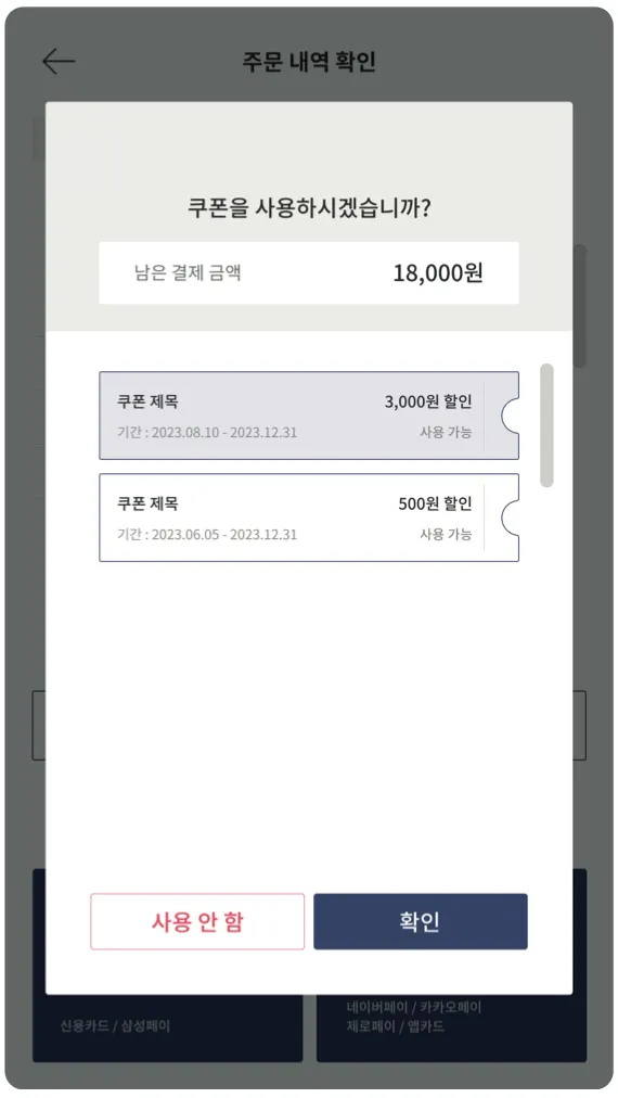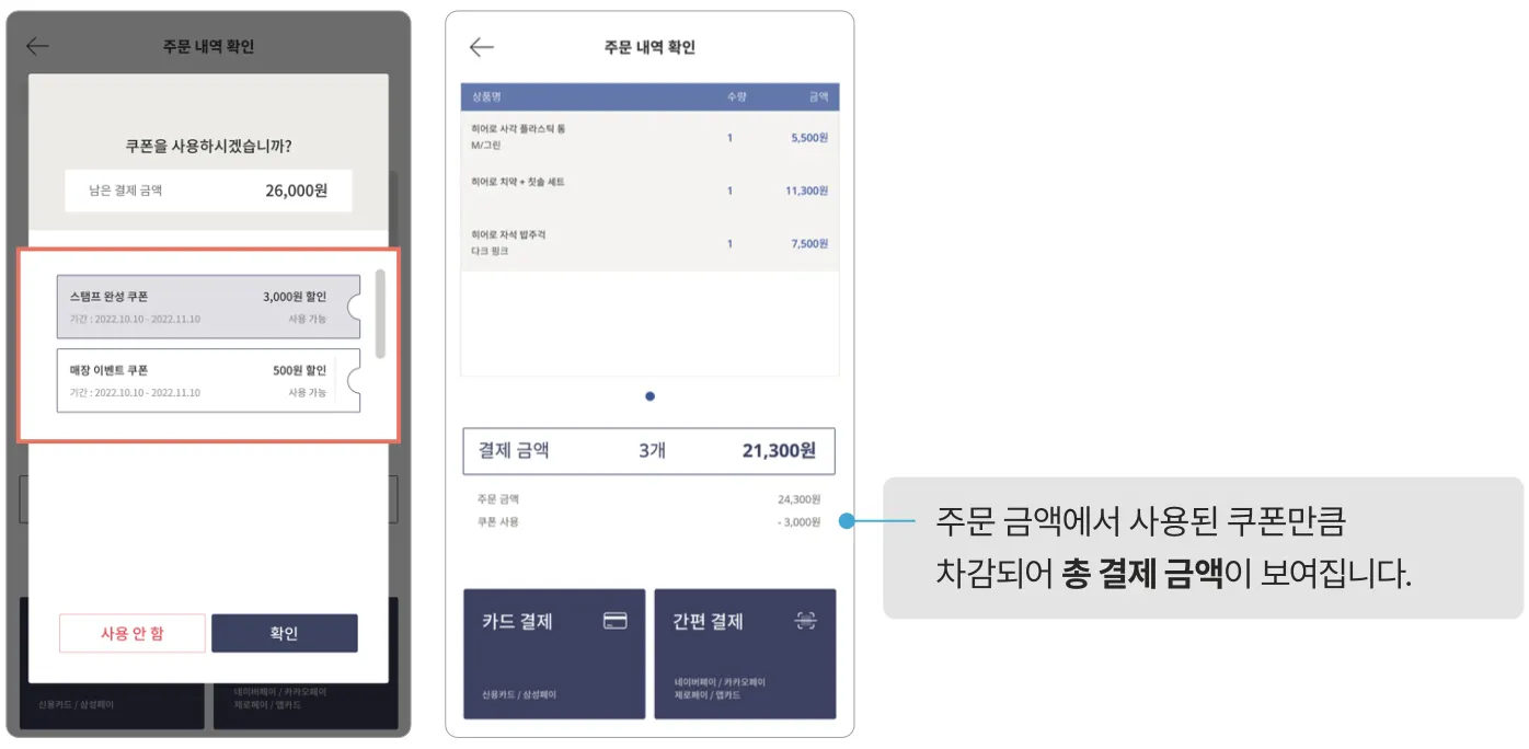 결제 화면에서 쿠폰 사용 금액을 확인할 수 있습니다.