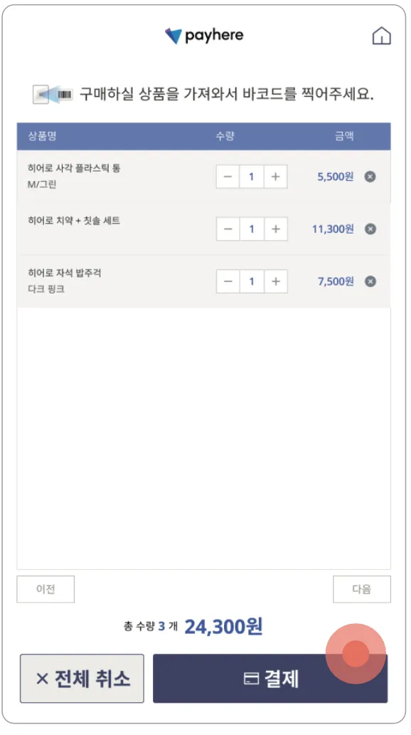 2) 스캔한 상품을 확인한 후 [결제] 버튼을 누릅니다.