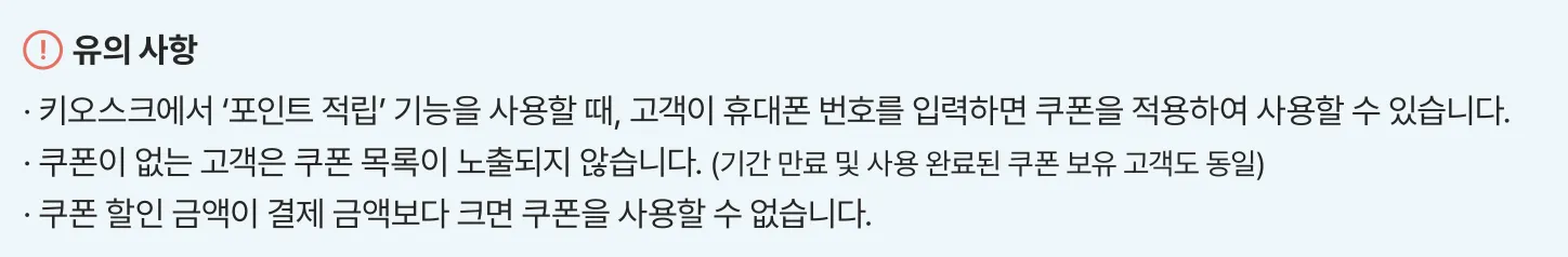 페이히어 셀러에서 발급한 쿠폰을 키오스크에서도 사용할 수 있습니다.