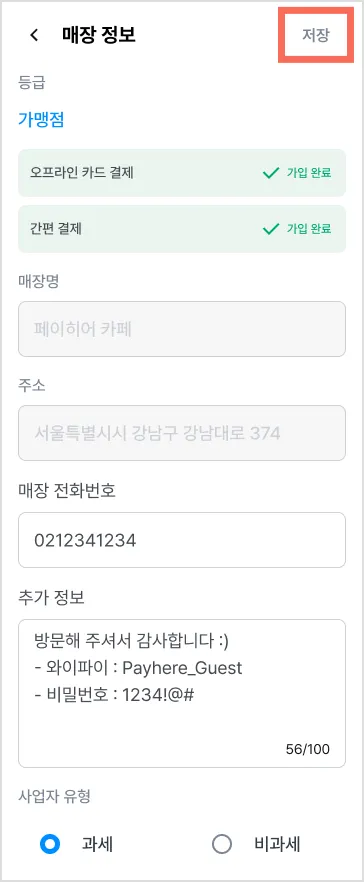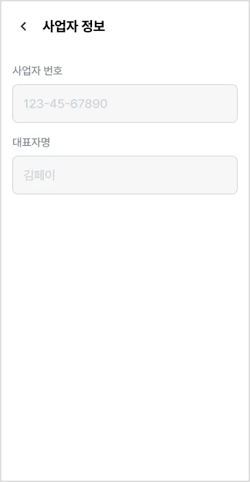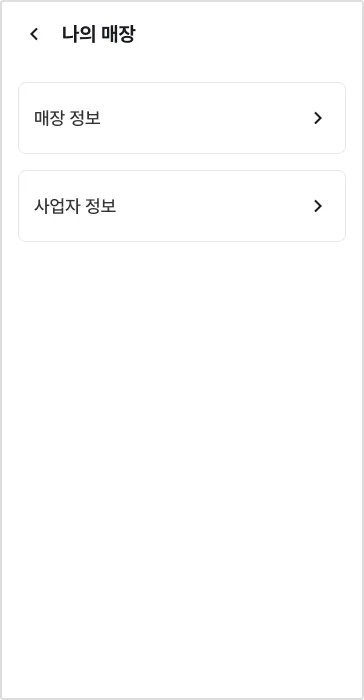 1) [더보기] 탭에서 [매장명 >] → [매장 정보 >] 또는 [사업자 정보 >]를 눌러주세요.