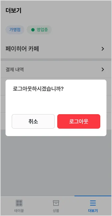 [더보기] 탭에서 [로그아웃] → [로그아웃]을 누르면 시작하기 화면으로 돌아가 재접속할 수 있어요.