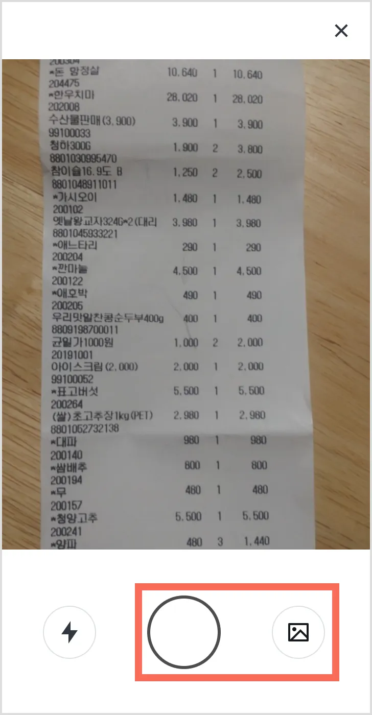 1) [촬영하기]를 눌러 구매 내역이 잘 보이도록 영수증을 [촬영]해 주세요.