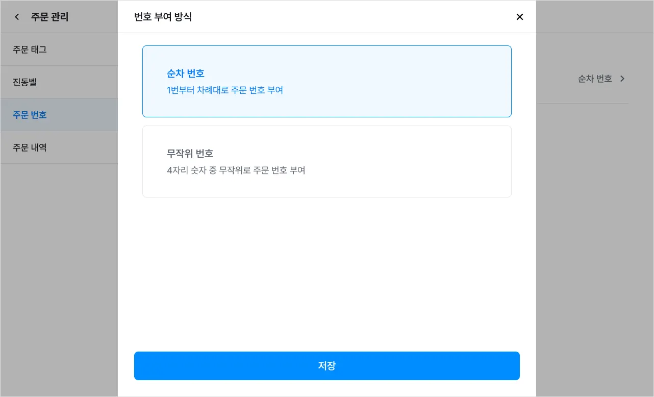 2) [순차 번호]와 [무작위 번호] 중 하나를 선택한 후 [저장]을 눌러주세요.
