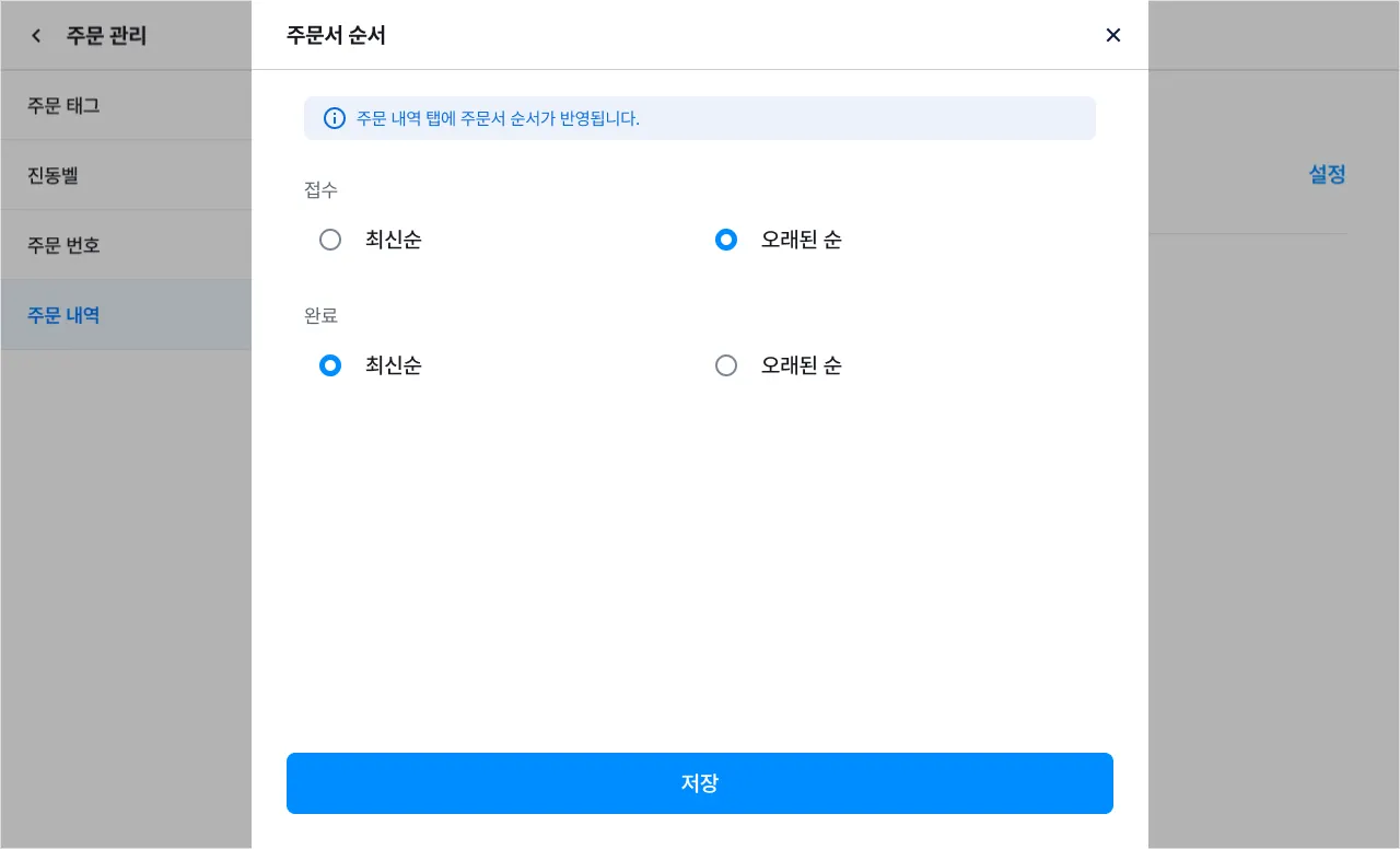 2) 주문 접수 · 주문 완료 별로 보기 순서를 설정할 수 있습니다.