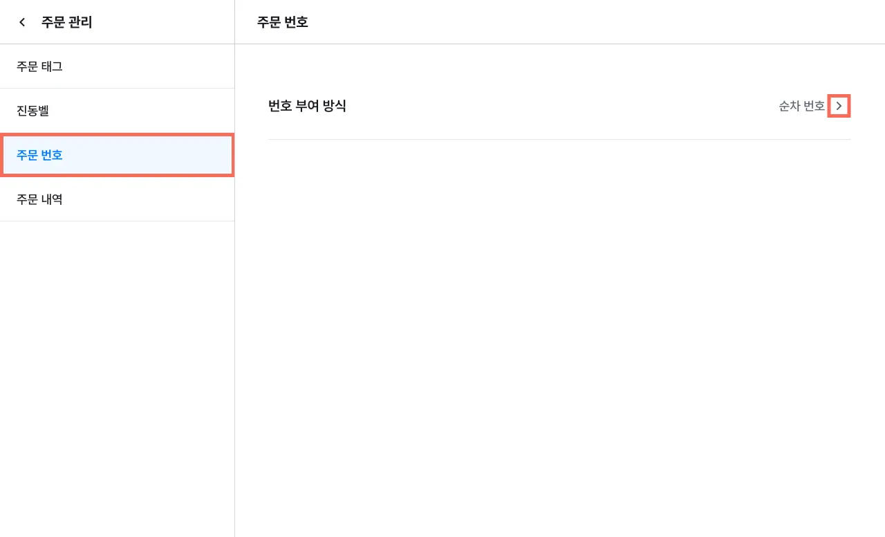 1) [주문 번호]에서 번호 부여 방식 옆 [>]를 눌러주세요.
