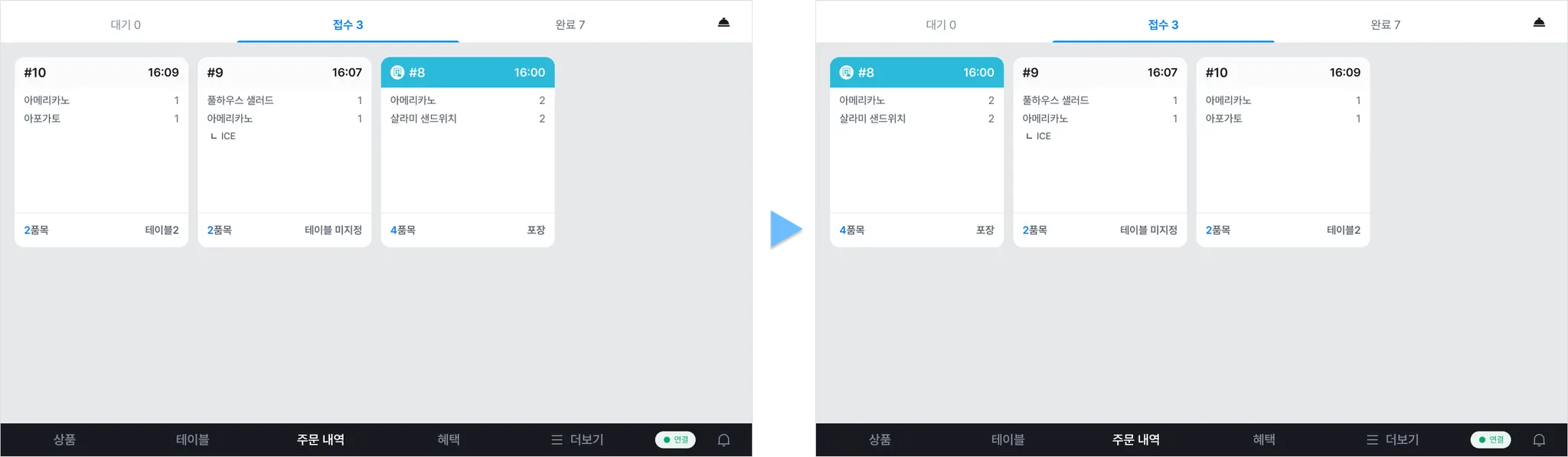 3) [주문 내역] 탭에서 변경된 순서를 확인할 수 있습니다.