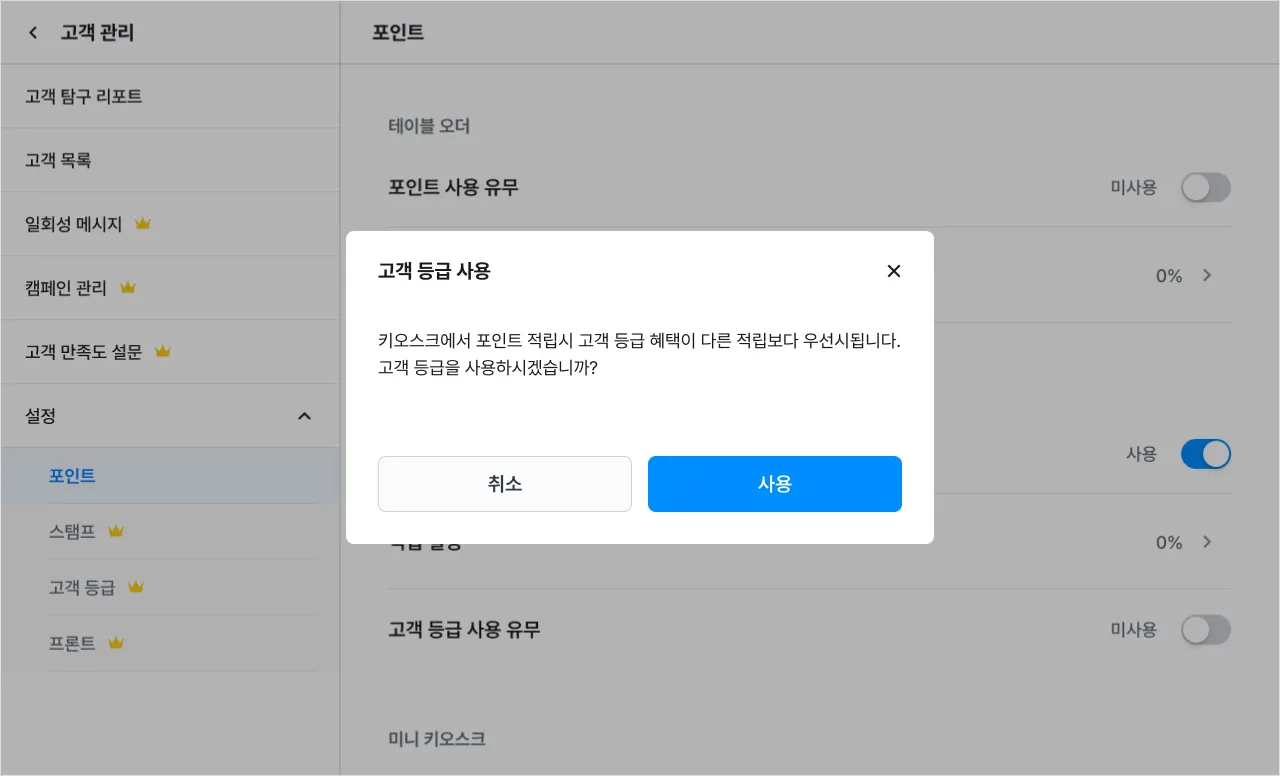 해당 기능을 사용으로 설정하면 다른 적립 설정보다 고객 등급 혜택이 우선 적용돼요.