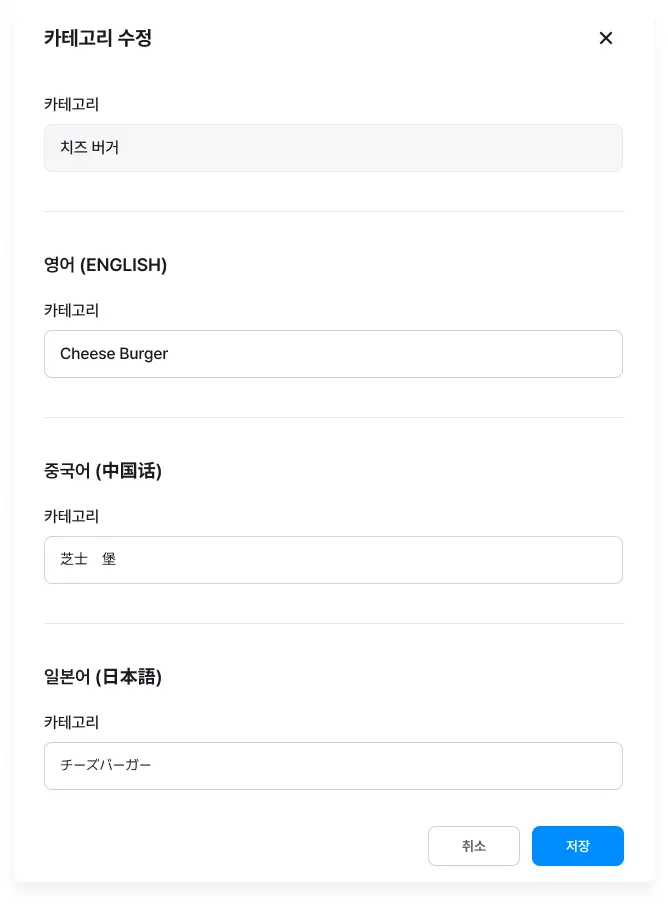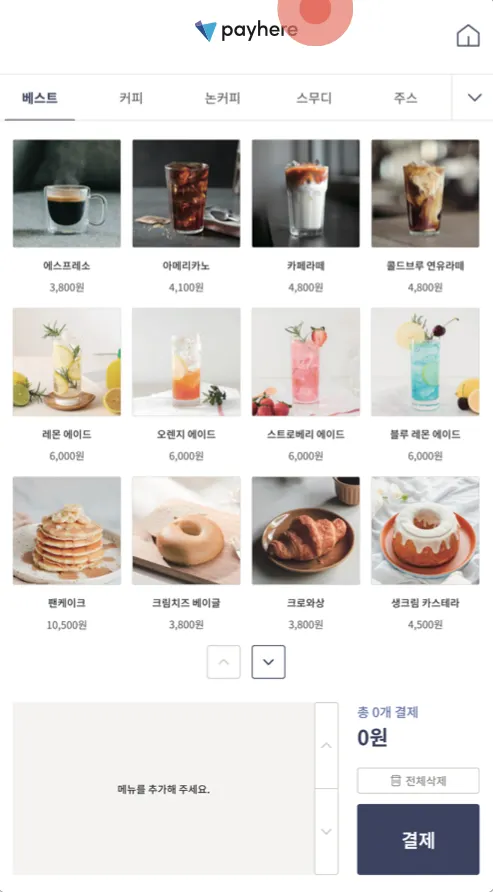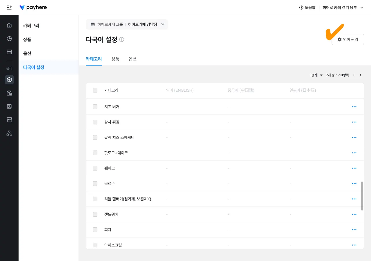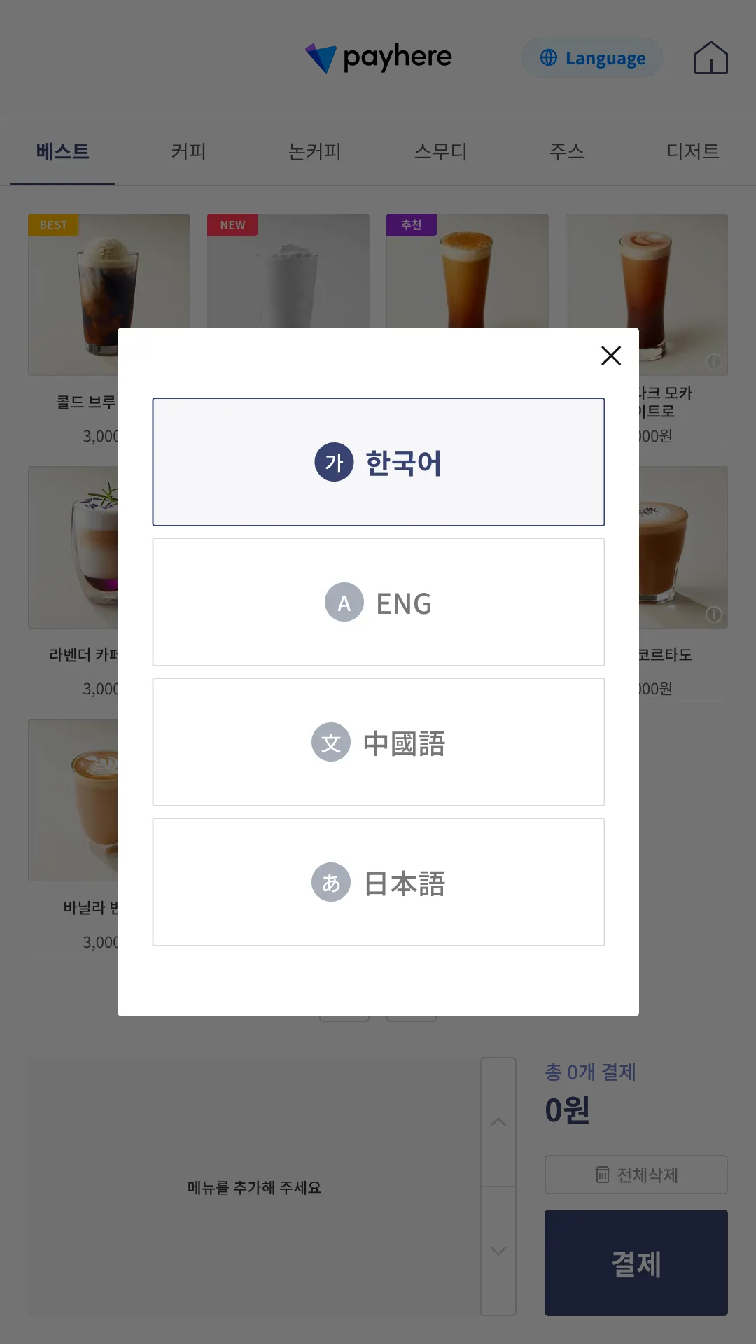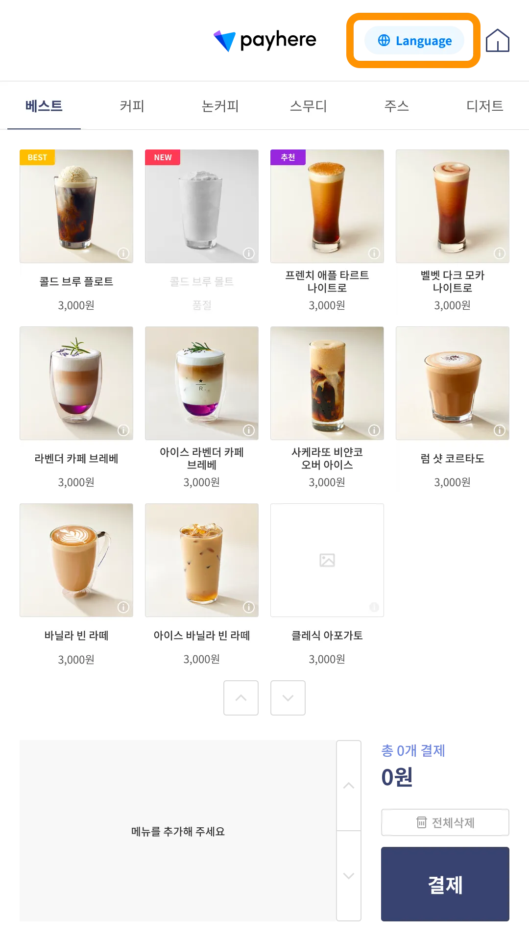 다국어 설정 후 해외 언어로 결제 시 포인트•스탬프 사용/적립, 쿠폰•선불권 사용이 불가합니다.