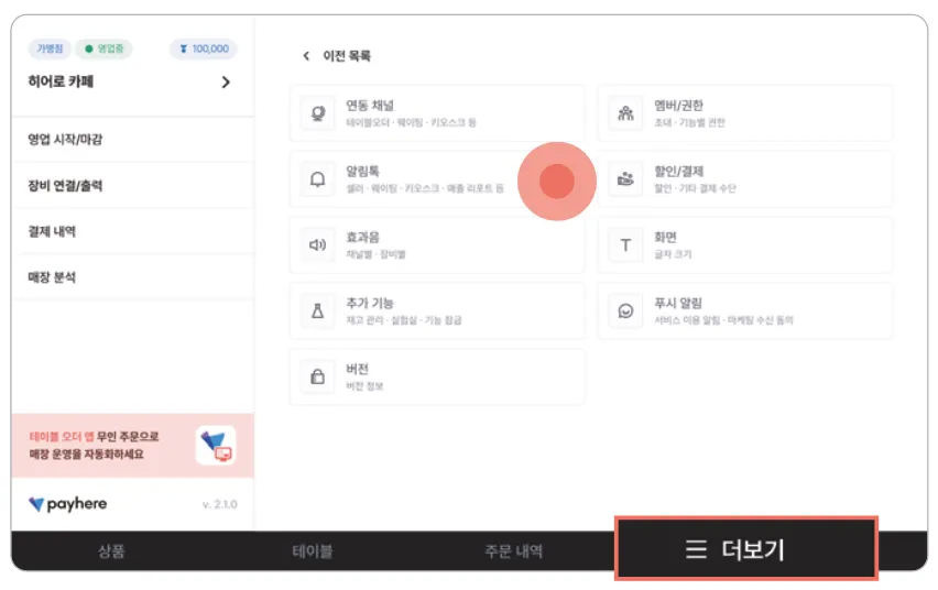 4-1) 키오스크 화면에 있는 페이히어 로고를 5번 연속 터치해 관리자 모드에 접속해 주세요.
