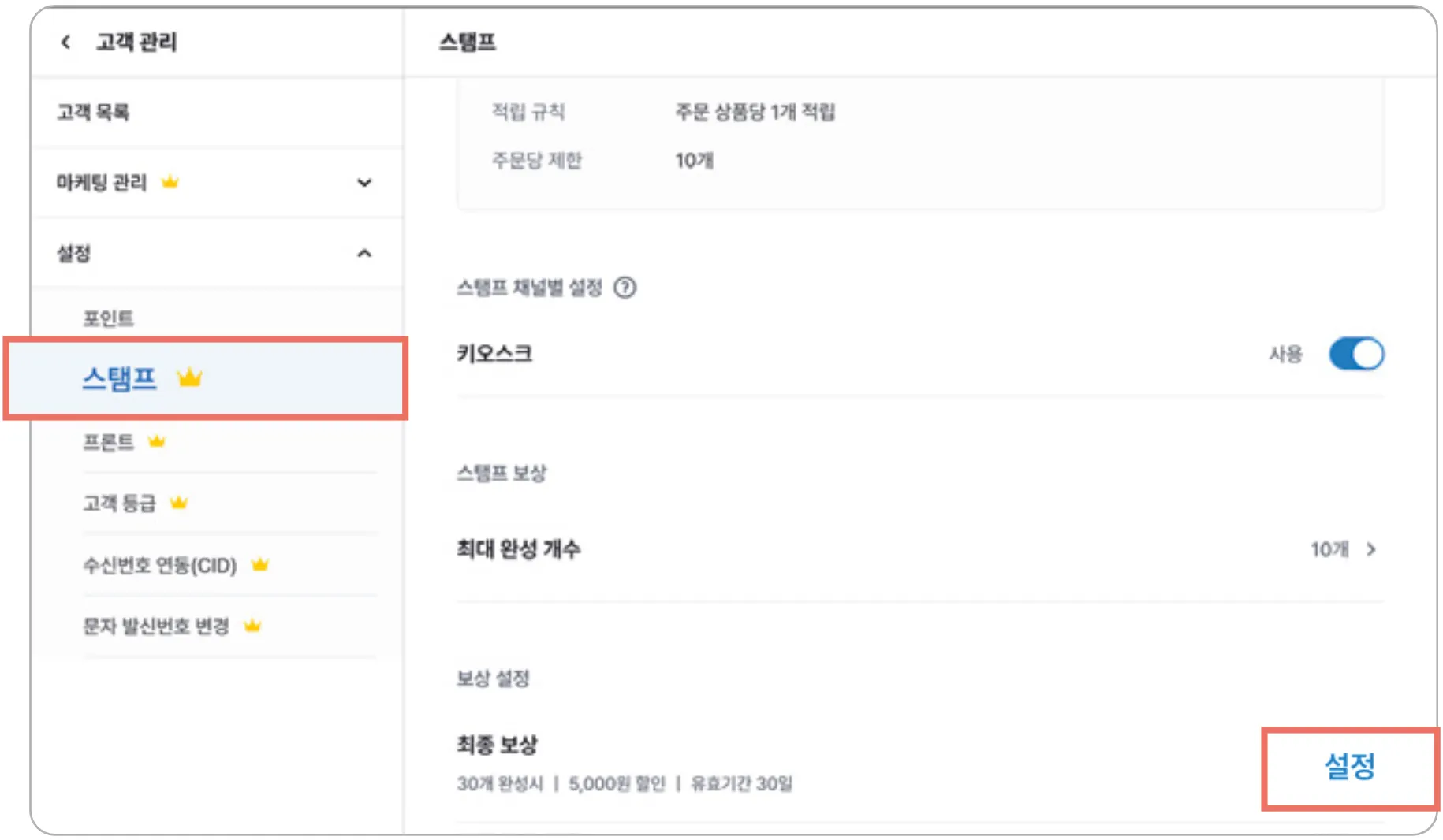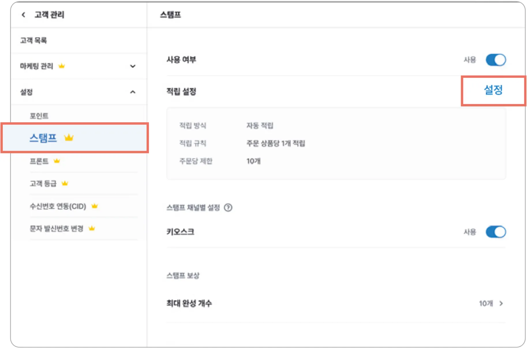 2) [스탬프] → [적립 설정]에서 [설정]을 눌러주세요.