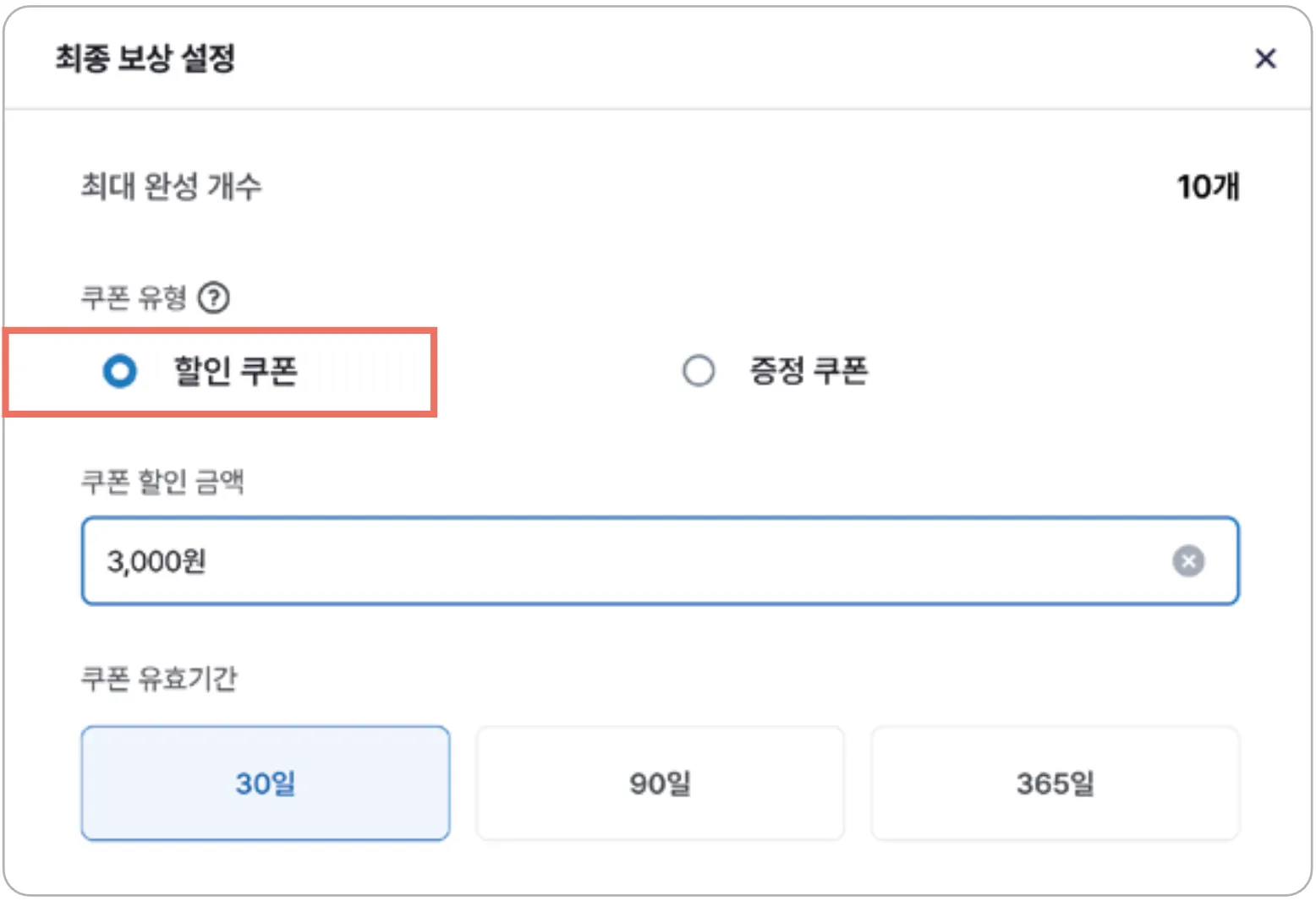 키오스크 최종 보상은 [할인 쿠폰] 유형으로만 이용할 수 있습니다.