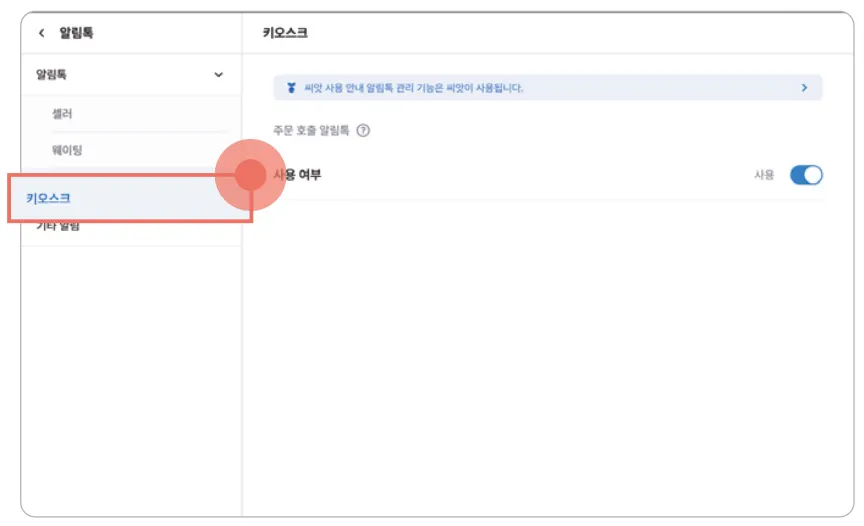 2) [키오스크]에서 주문 접수 알림톡을 설정할 수 있습니다.