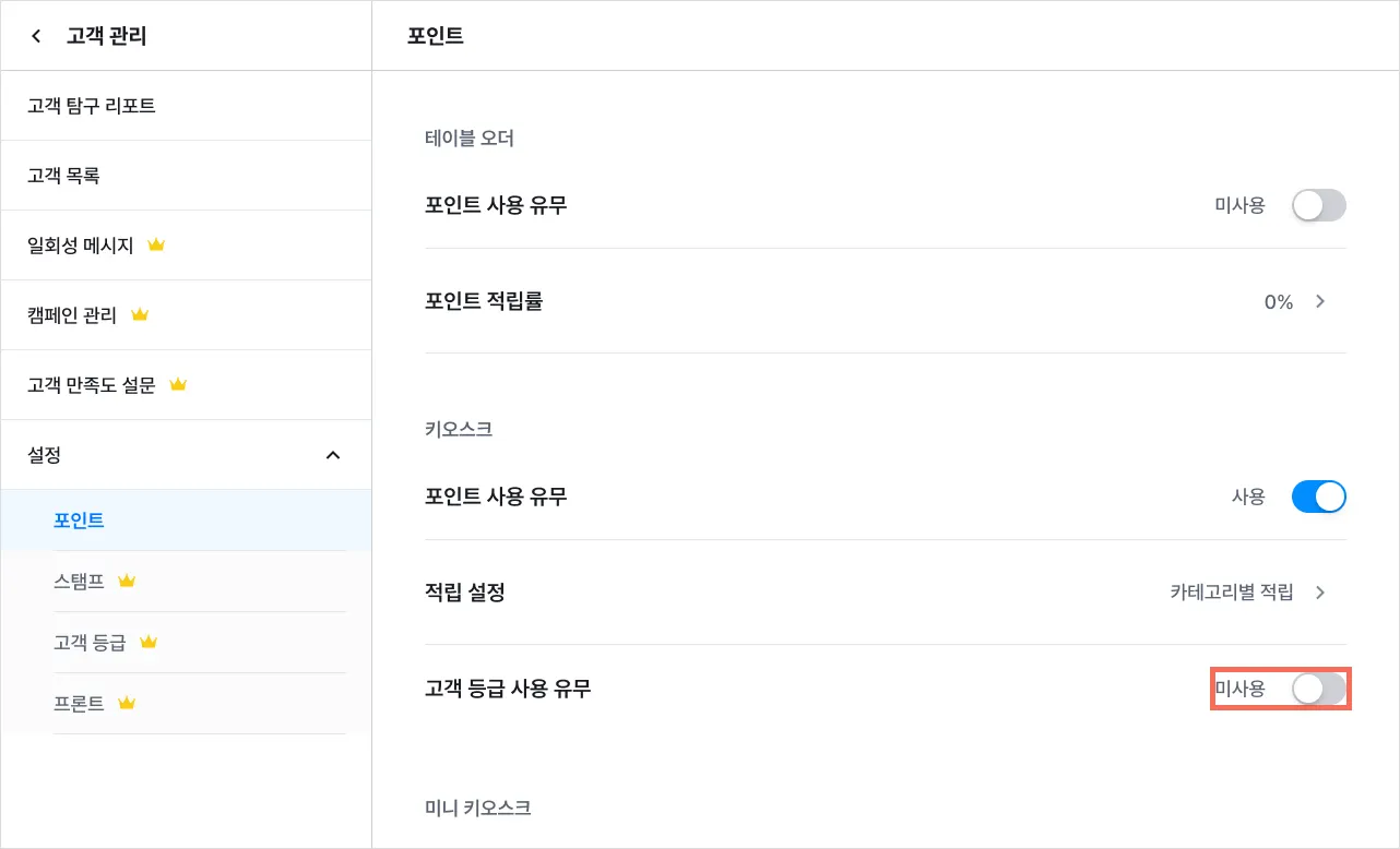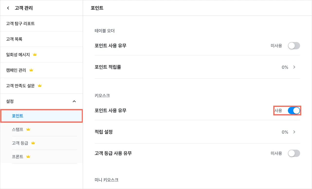 2) [포인트]에서 키오스크 포인트 사용 유무를 ‘사용’으로 설정해 주세요.