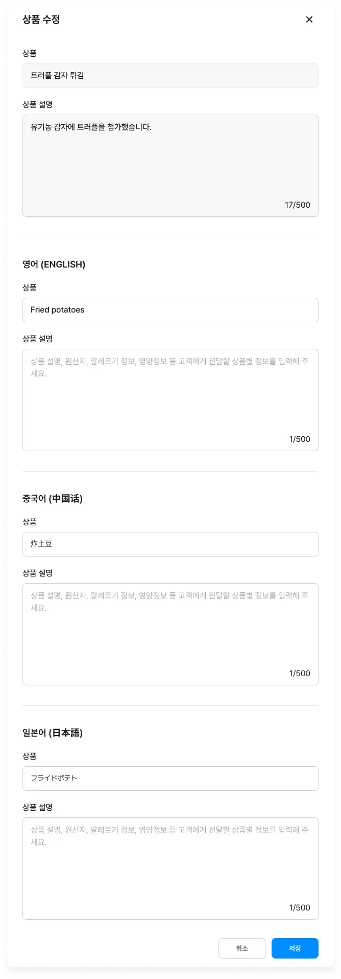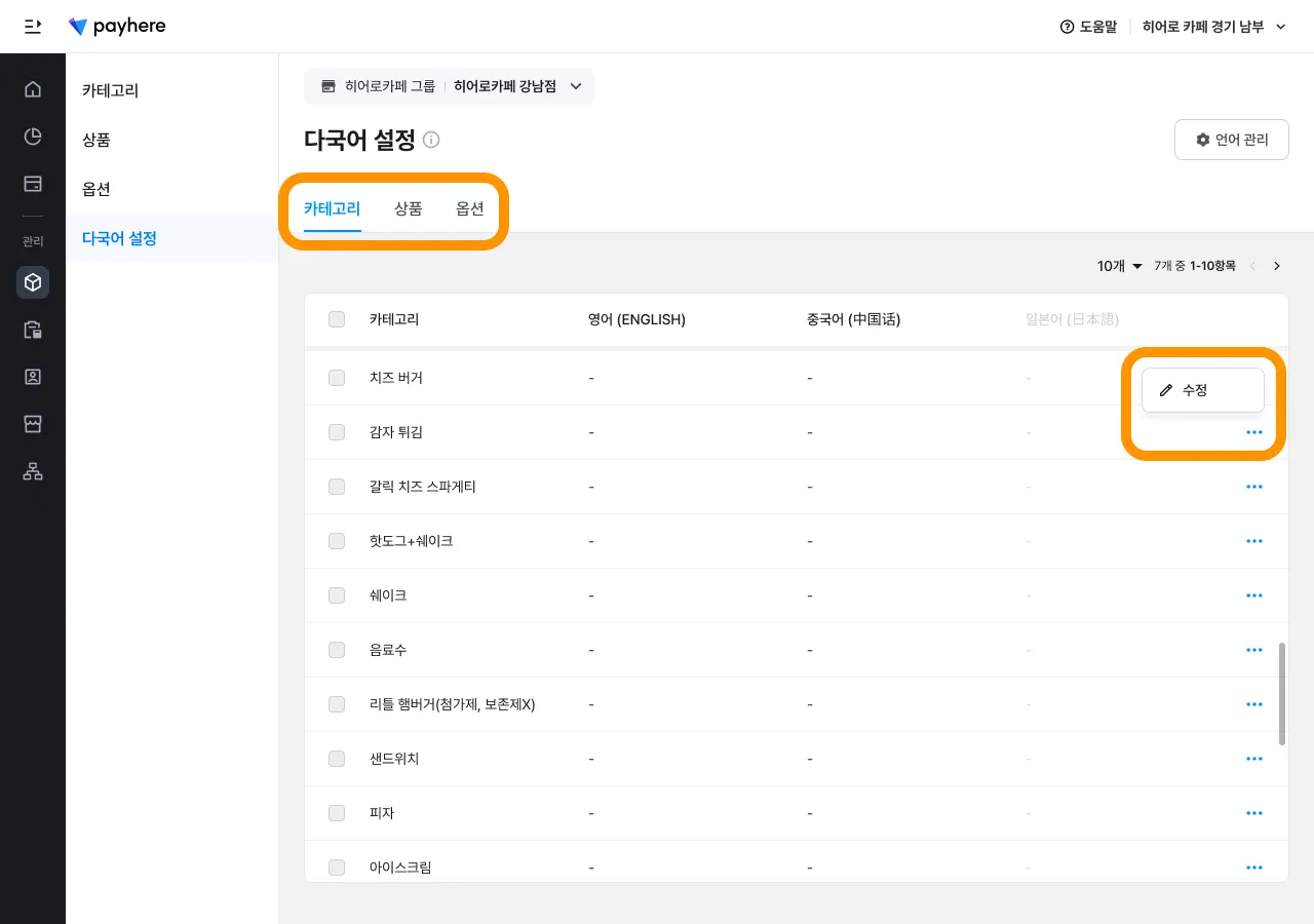3) [카테고리 / 상품 / 옵션] 탭에서 각 상품 오른쪽의 [・・・] 버튼을 눌러 번역한 정보를 입력해 주세요.
