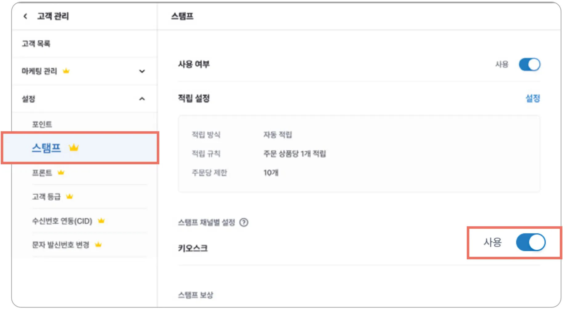 4) 스탬프 채널별 설정에서 [키오스크] 버튼을 활성화해 주세요.
