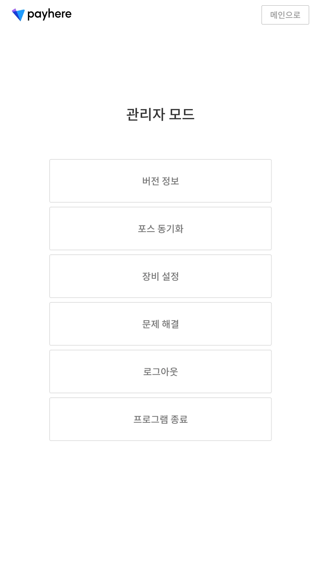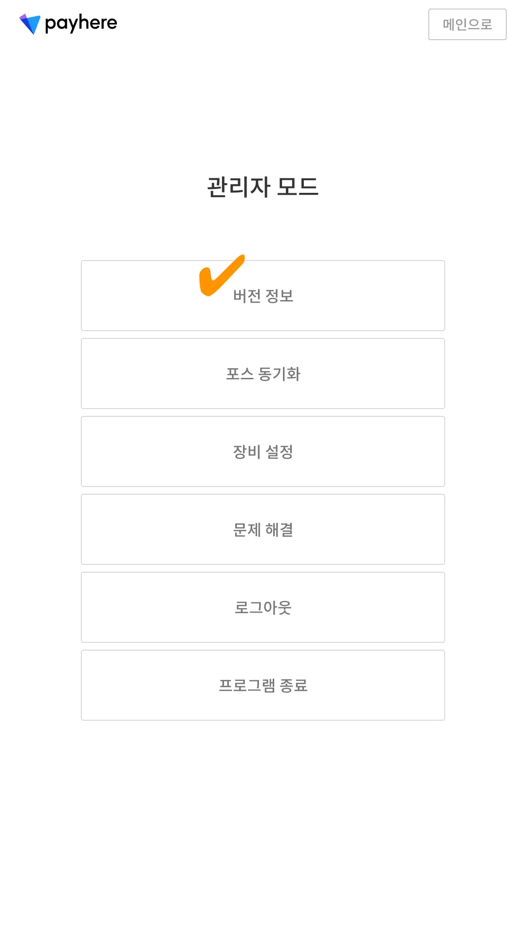 1) 키오스크 화면에 있는 페이히어 로고를 5번 연속 터치해 관리자 모드에 접속해 주세요.