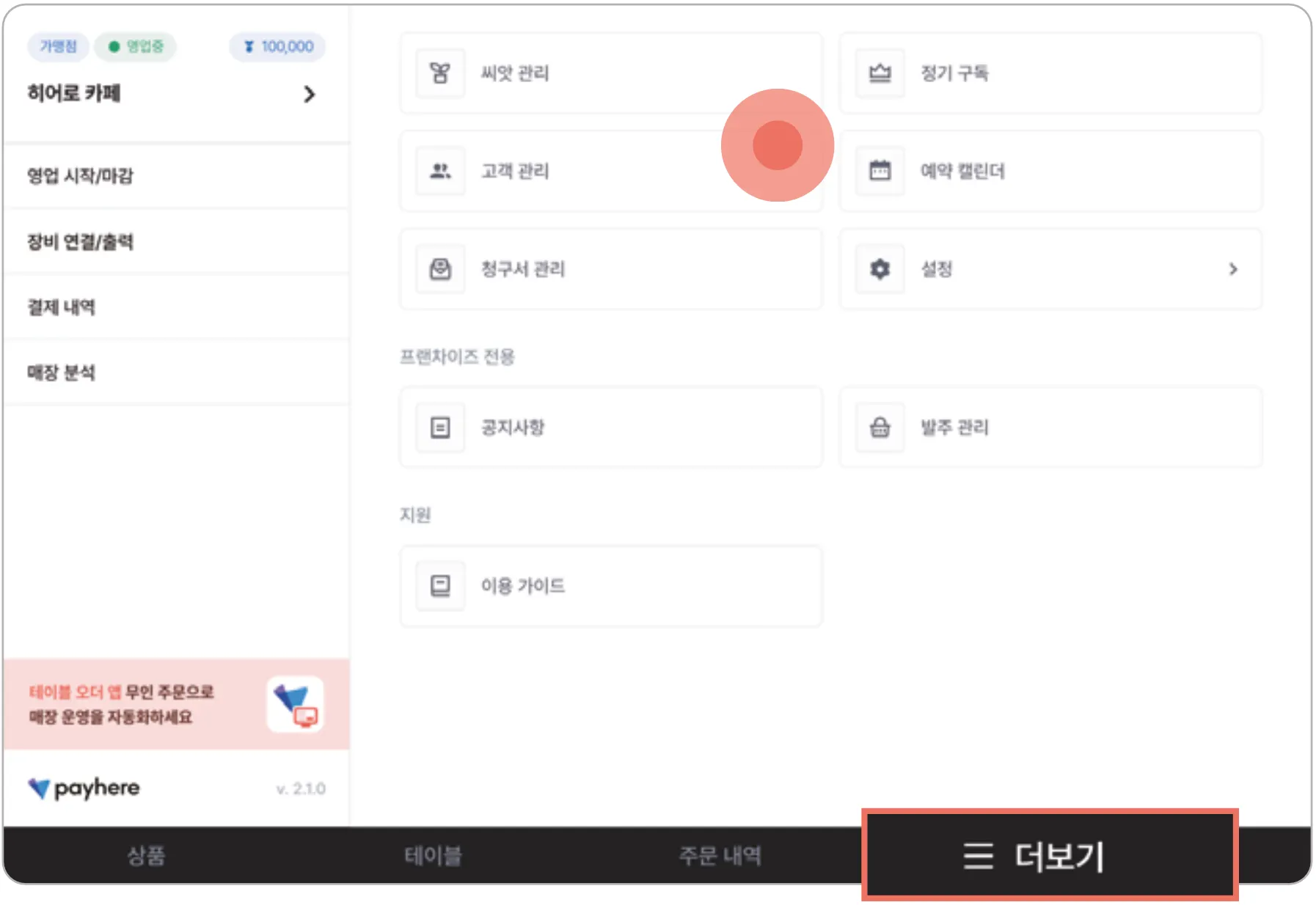 1) [더보기] → [고객 관리]를 눌러주세요.