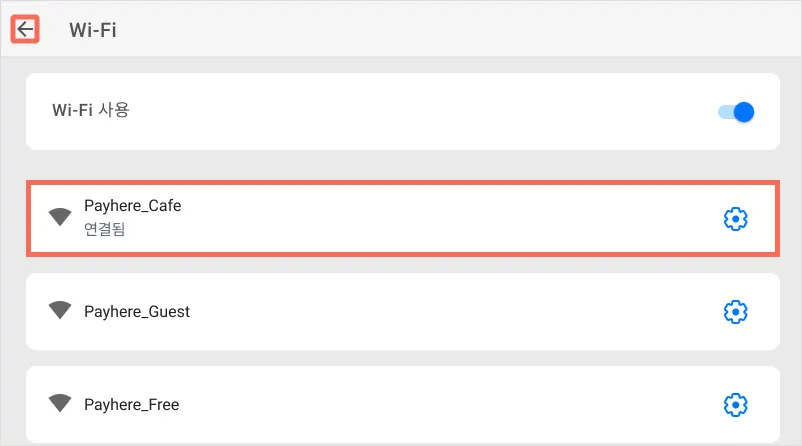 ①  화면의 [Wi-Fi 연결]을 눌러 사용할 와이파이를 연결해 주세요.