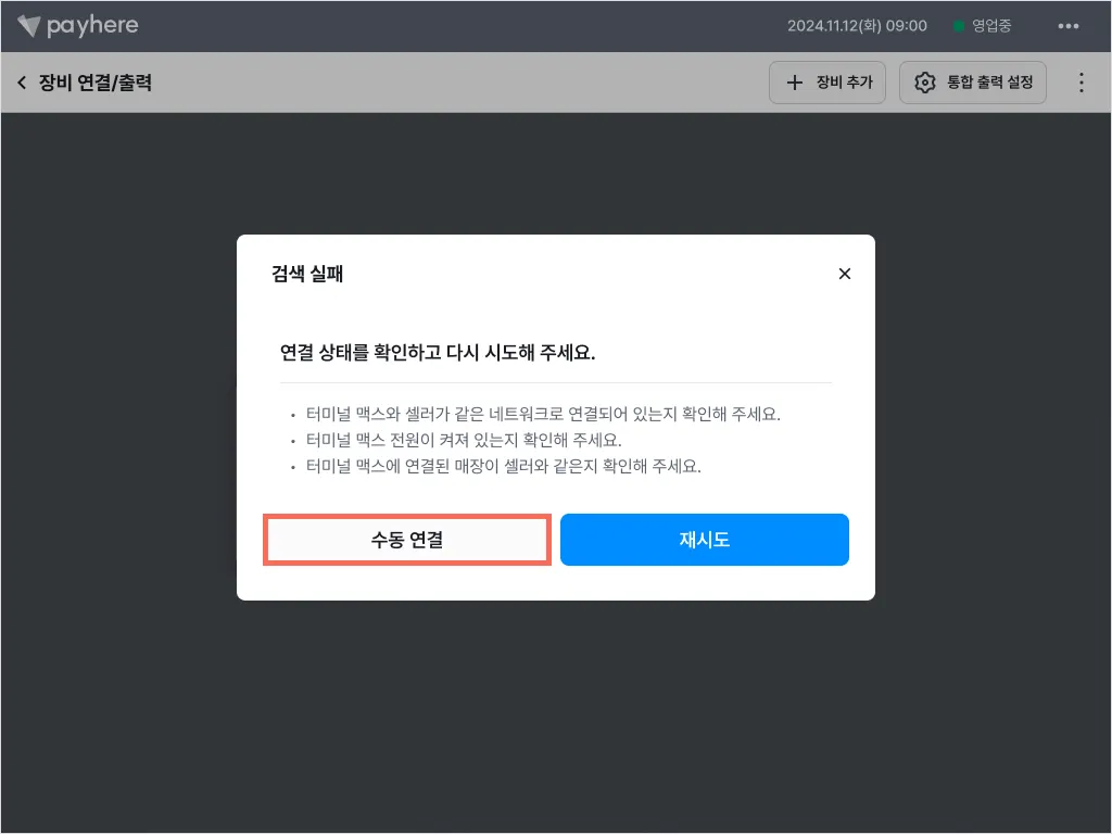 2) 검색 실패 창에서 [수동 연결]을 눌러주세요.