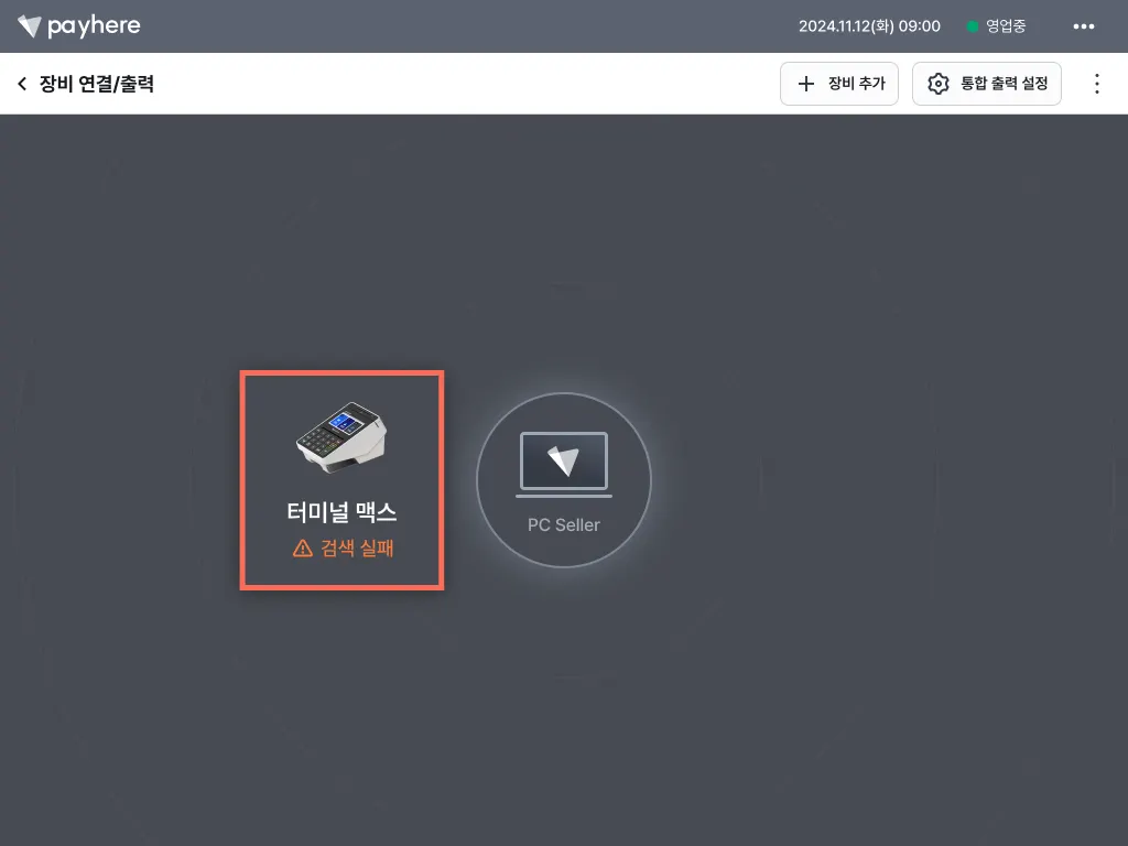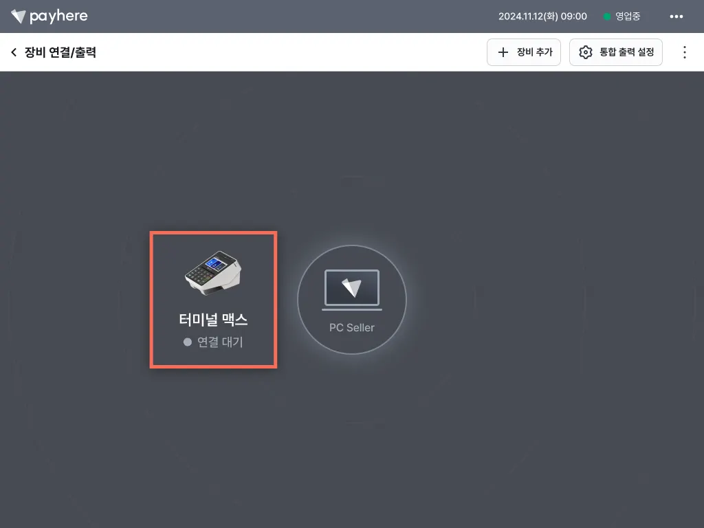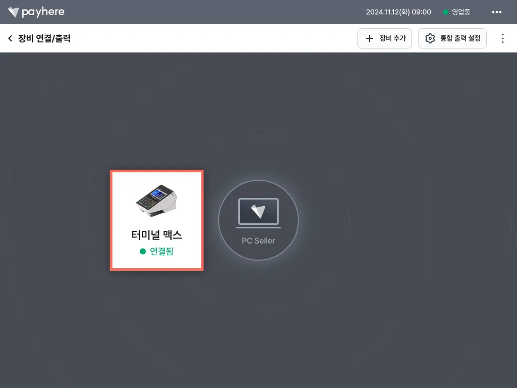 [더보기] 탭 → [장비 연결/출력] → ● 연결됨 상태의 [터미널 맥스] → [기기 정보 ∨]에서 VAN사 확인이 가능해요.