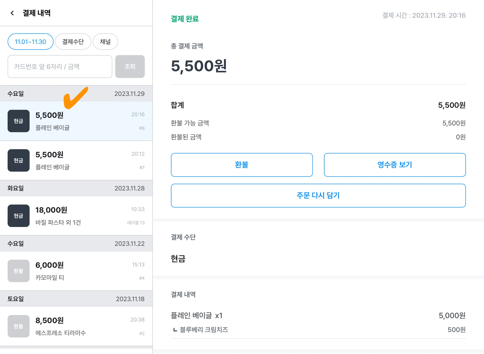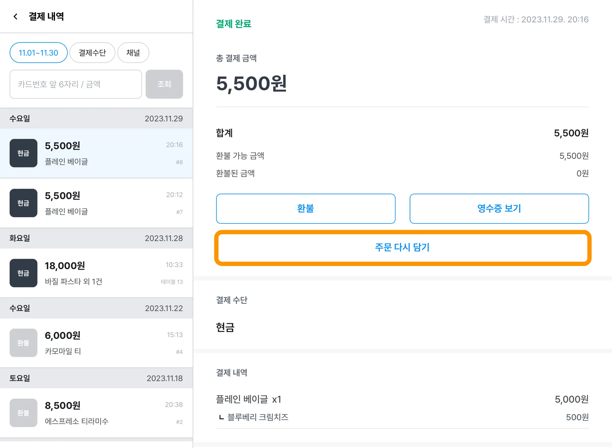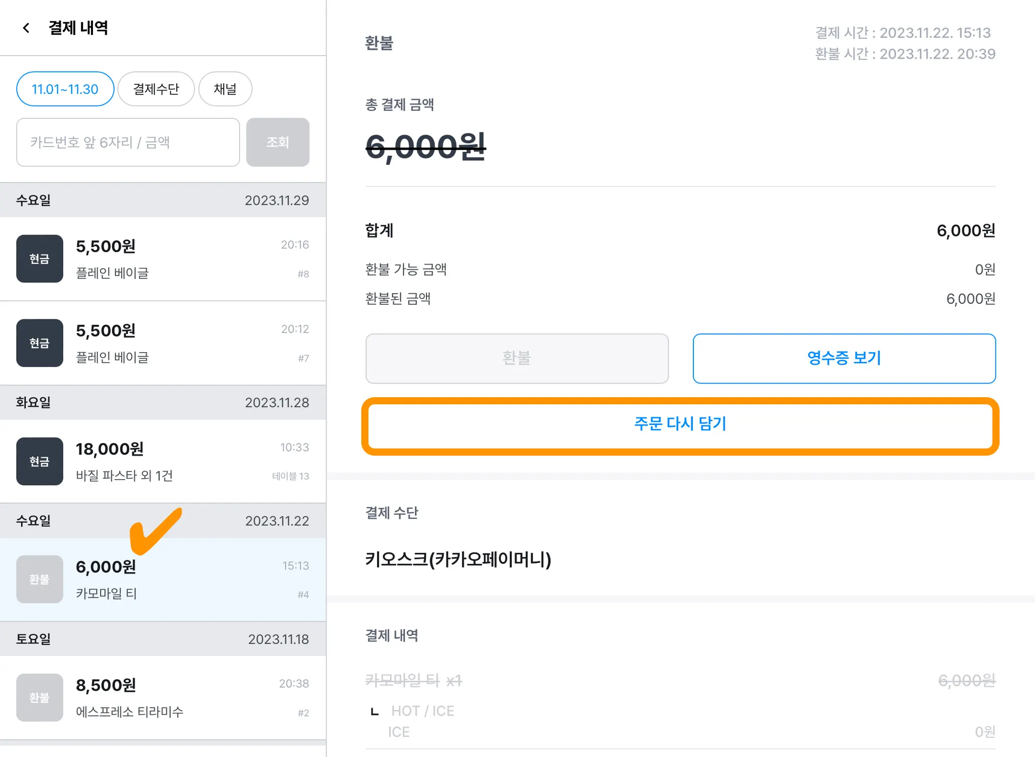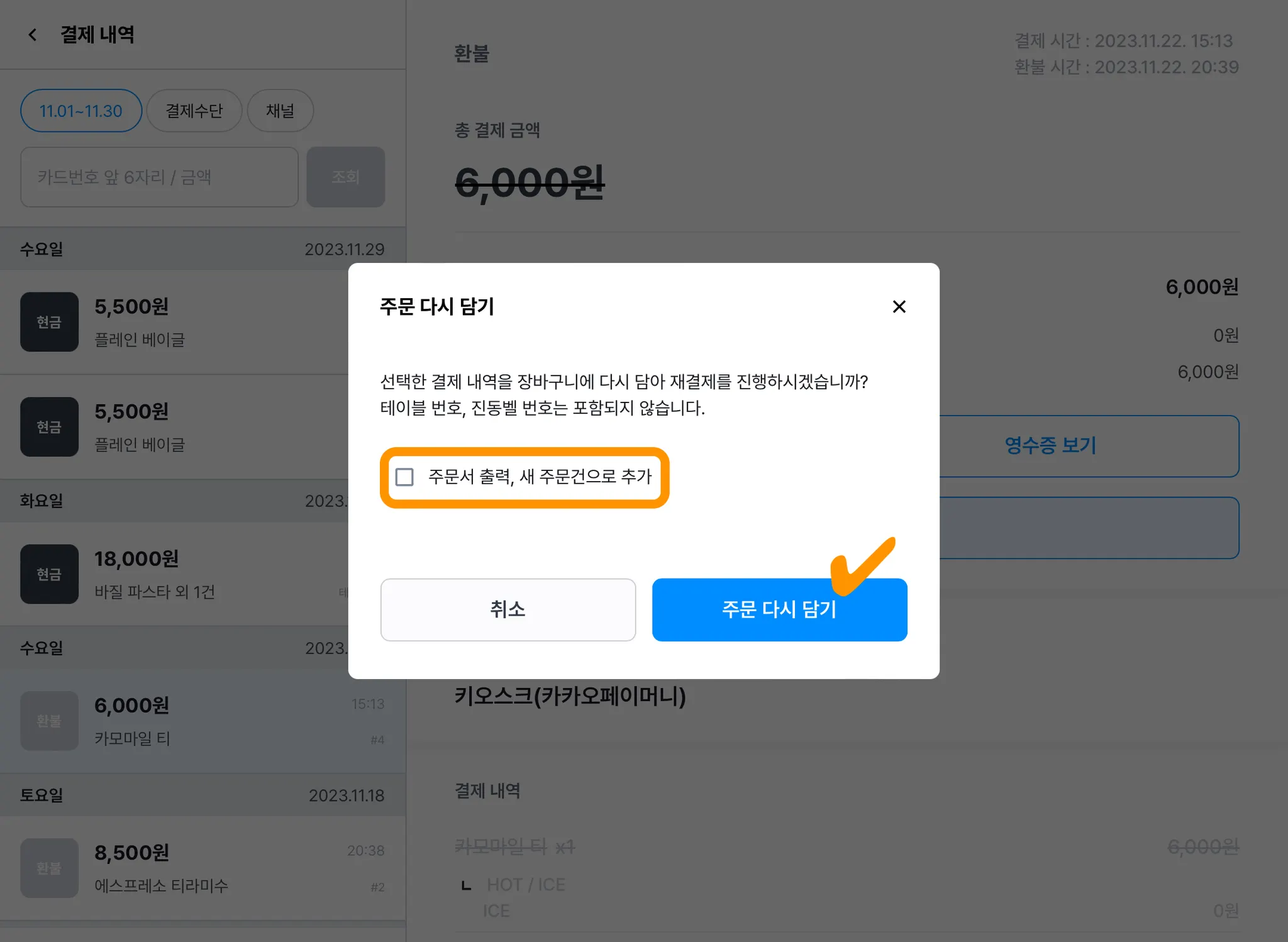 카페/음식점 유형 매장이라면 결제 내역과 환불 내역을 그대로 장바구니에 다시 담을 수 있어요.