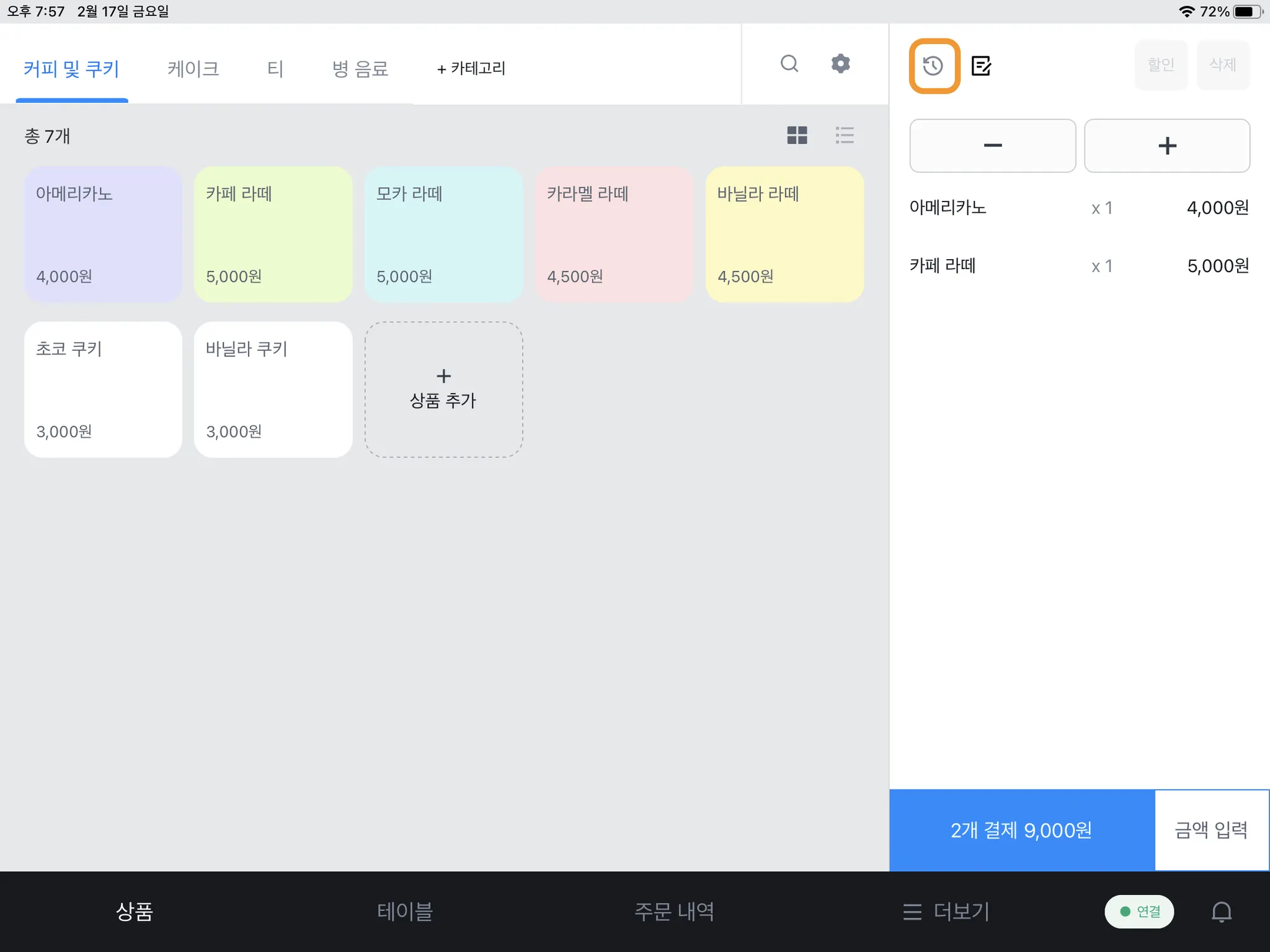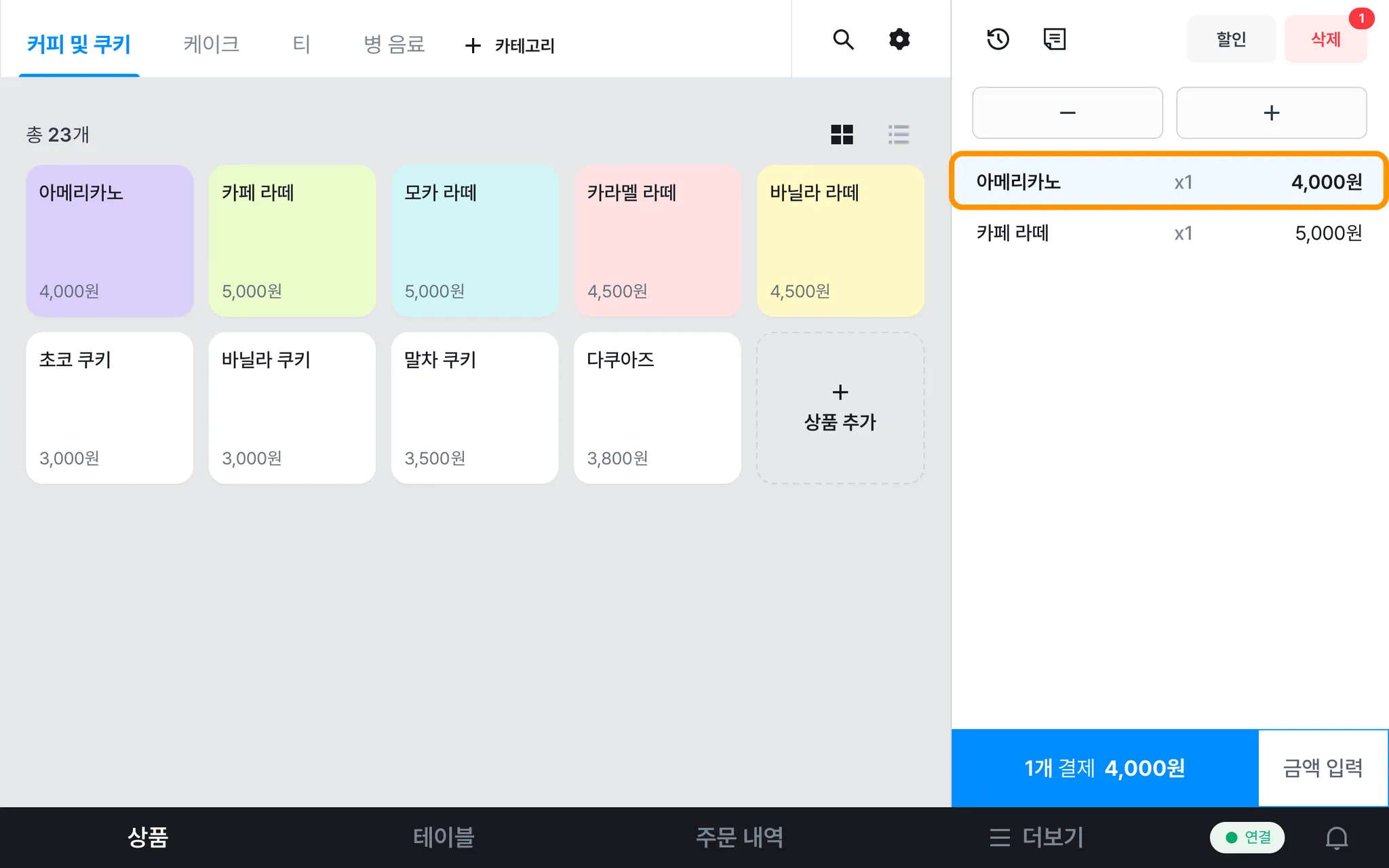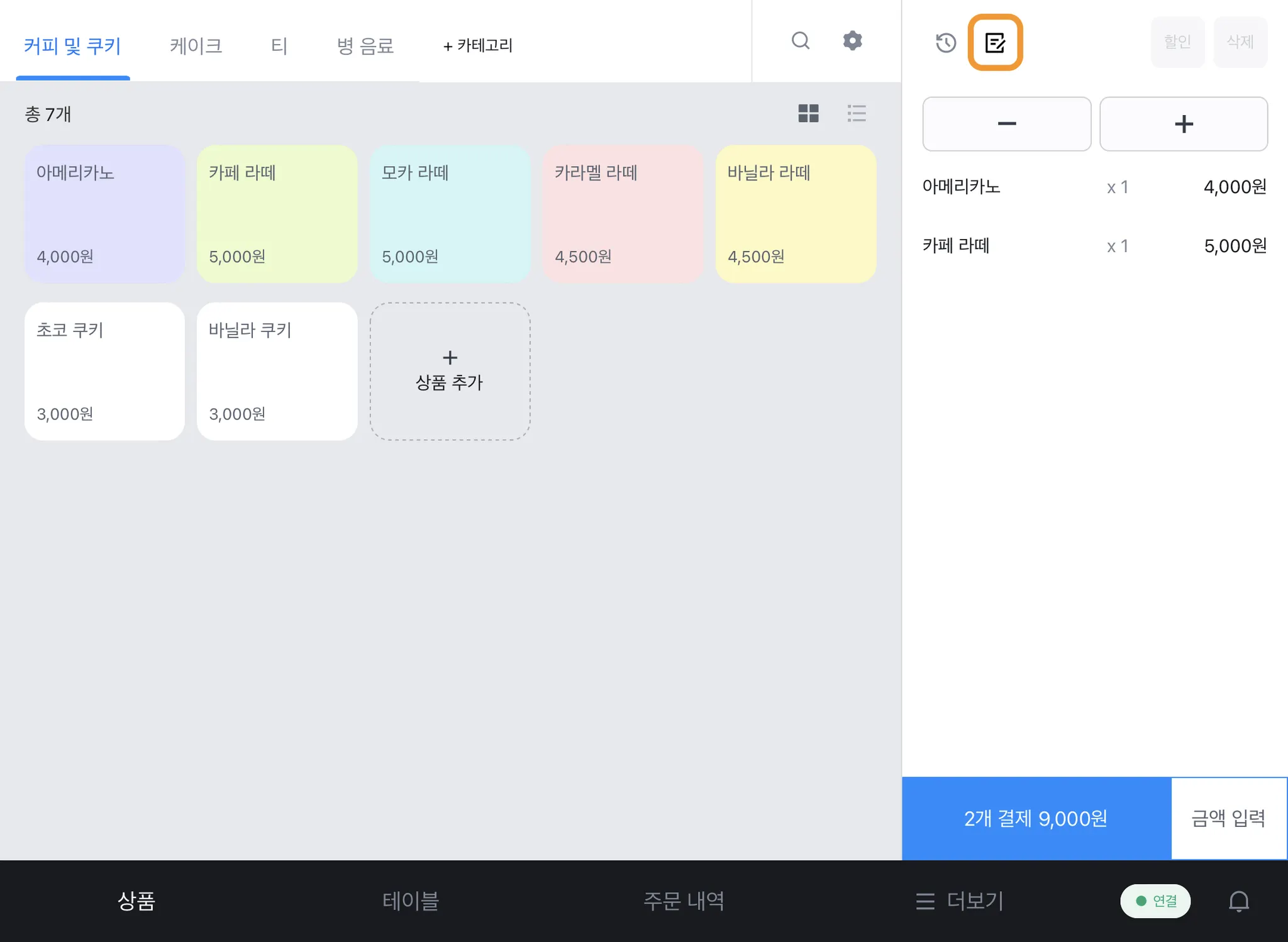 1) [상품] 탭에서 주문을 추가하고 오른쪽 상단 [